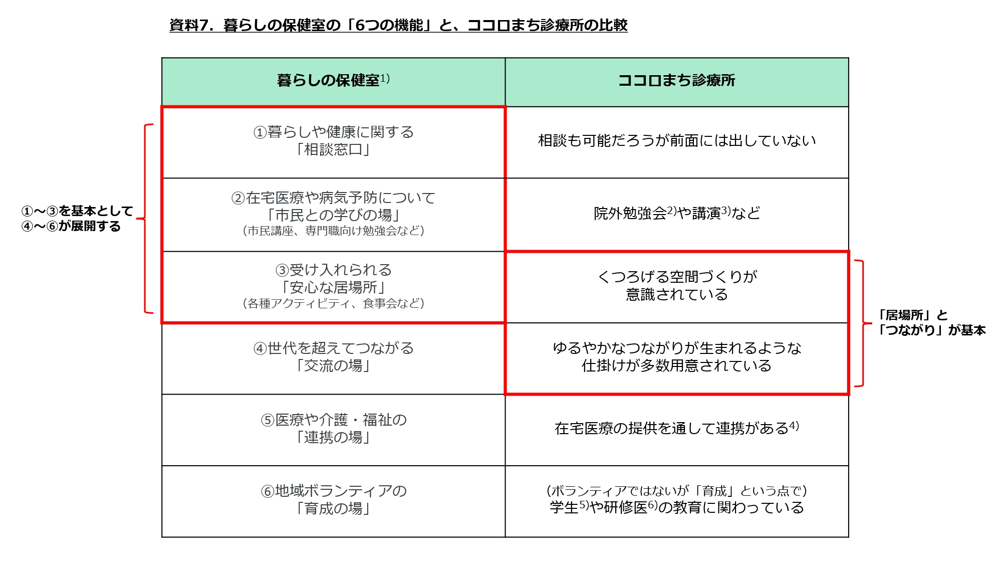資料7:暮らしの保健室の「6つの機能」と、ココロまち診療所の比較