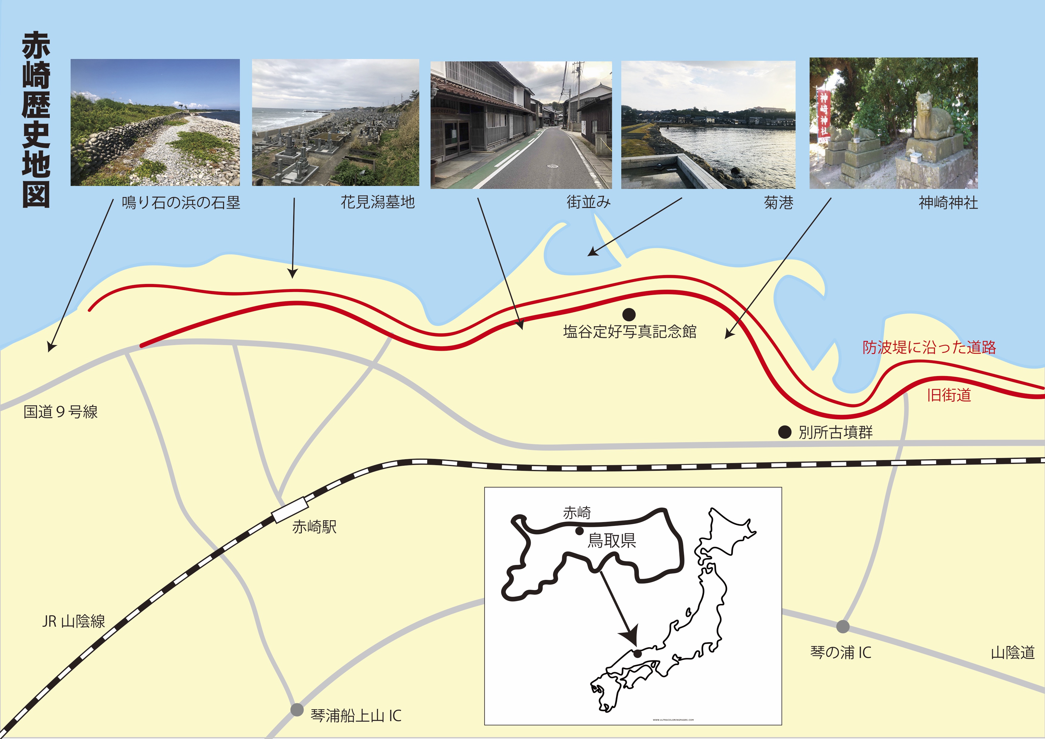 赤崎には、歩いて1時間位のところに沢山の歴史遺産が残されている。古墳跡のある「別所」や牛馬の守護神として参拝された「神崎神社」、中世より自然発生し2万基の墓が立ち並ぶ「花見潟墓地」、江戸時代に作られた「菊港」や商家を使った「塩谷定好写真記念館」、繁栄した過去の面影を残す街並みなどがある。これらに自然の活動や石塁が残る「鳴り石の浜」を加えれば、変化に富んだ日本の歴史だけでなく環境問題など未来も学ぶことができる。[図8]