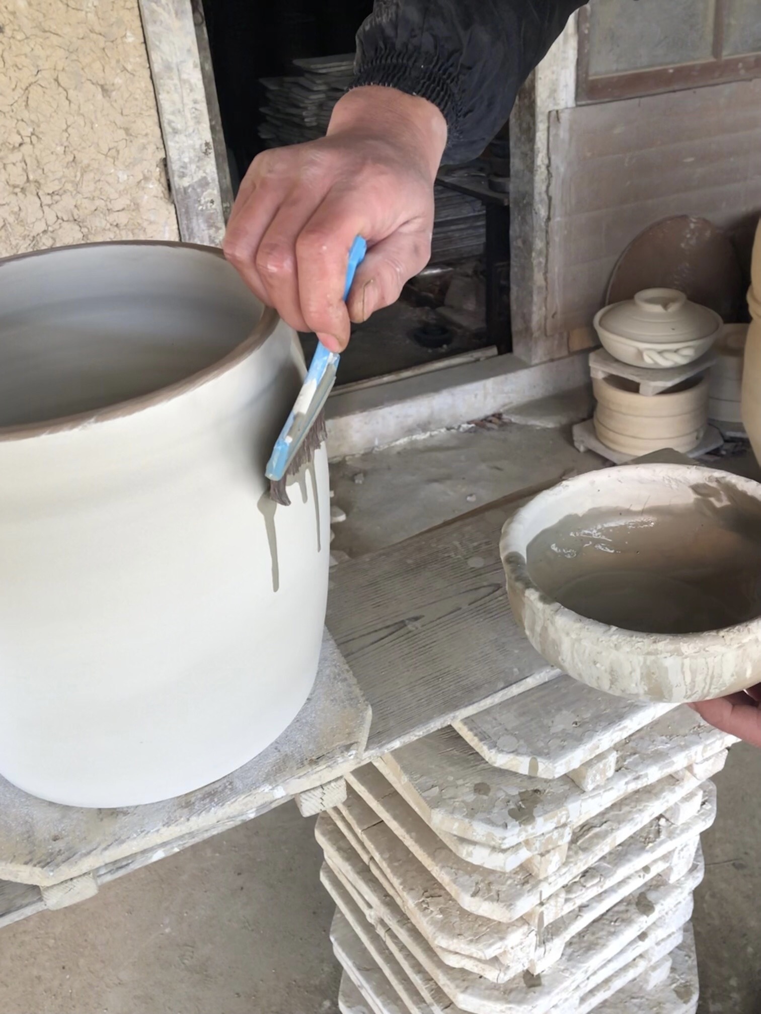 ・註2:しのづくりは石見焼の大物づくりならではの製法で、ろくろの上で棒状の粘土を巻き上げて成形と乾燥を繰り返し、2〜4段ずつ継ぎながら作っていく製法。