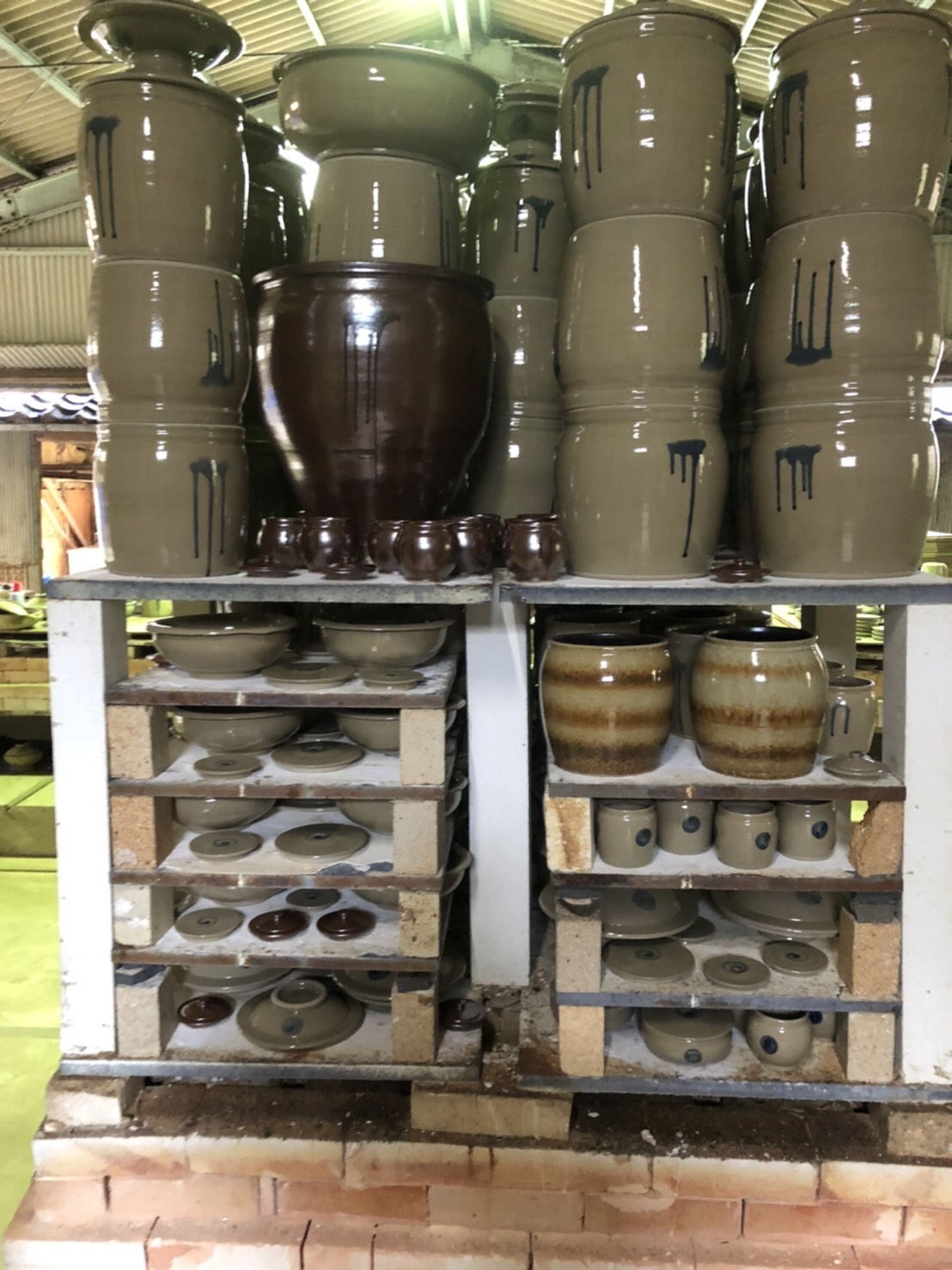 中国地方では珍しい7.5㎥の大きなガス窯で焼成する。上段にある赤茶色の甕が来待釉で、ベージュ色が温泉津長石釉。丸模様も昔からある柄である。 -