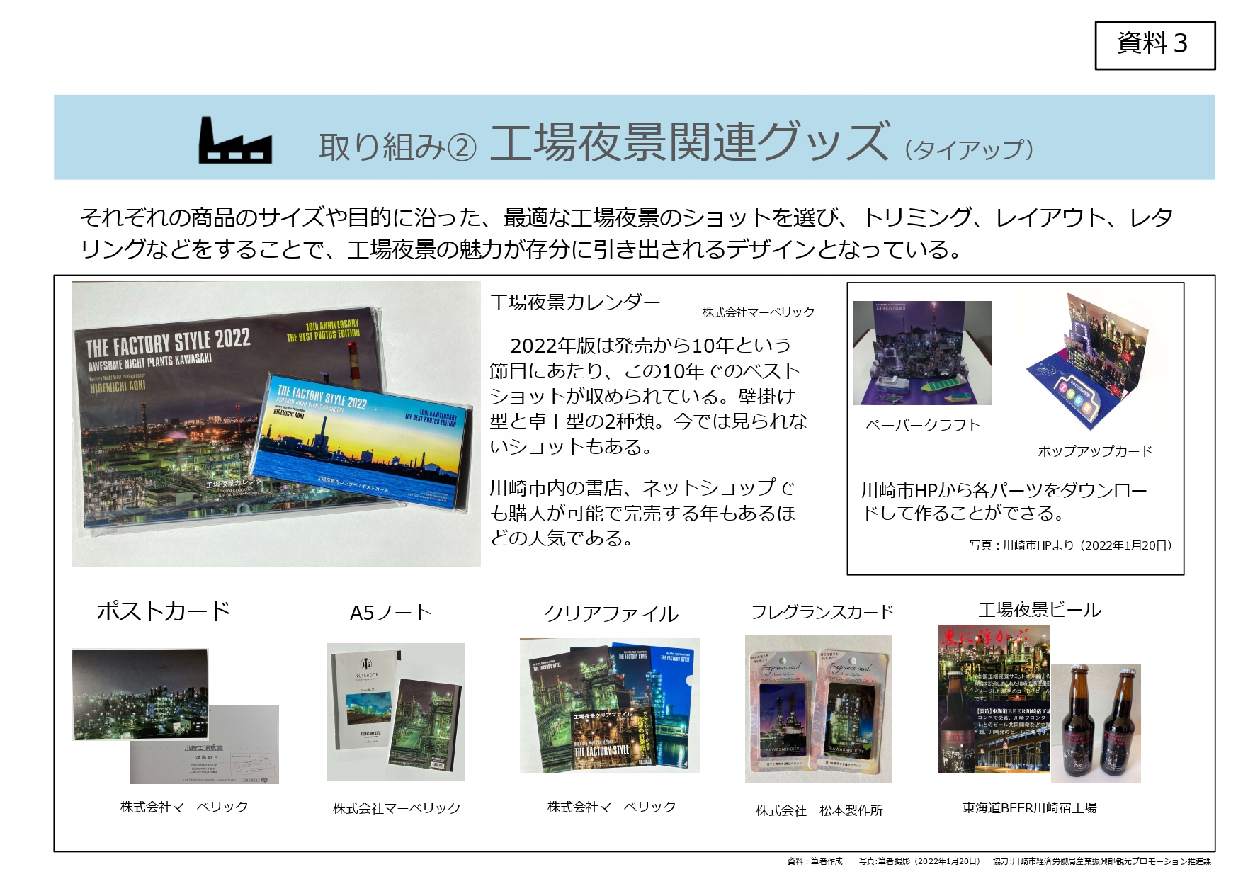 ツアーのほかに、ポストカードを始めとしたグッズとのタイアップもしている*23[資料3]。写真は、肉眼で見たものと同じにはならない。そこで、グッズには幻想的で工場夜景の目映さ、力強さが伝わる写真を使用している 。特に、2010年秋に発売を開始した全国初の工場夜景専門カレンダーは、その後も完売する年があるほどの人気で、川崎工場夜景を全国に売り込む起爆剤となった*24。