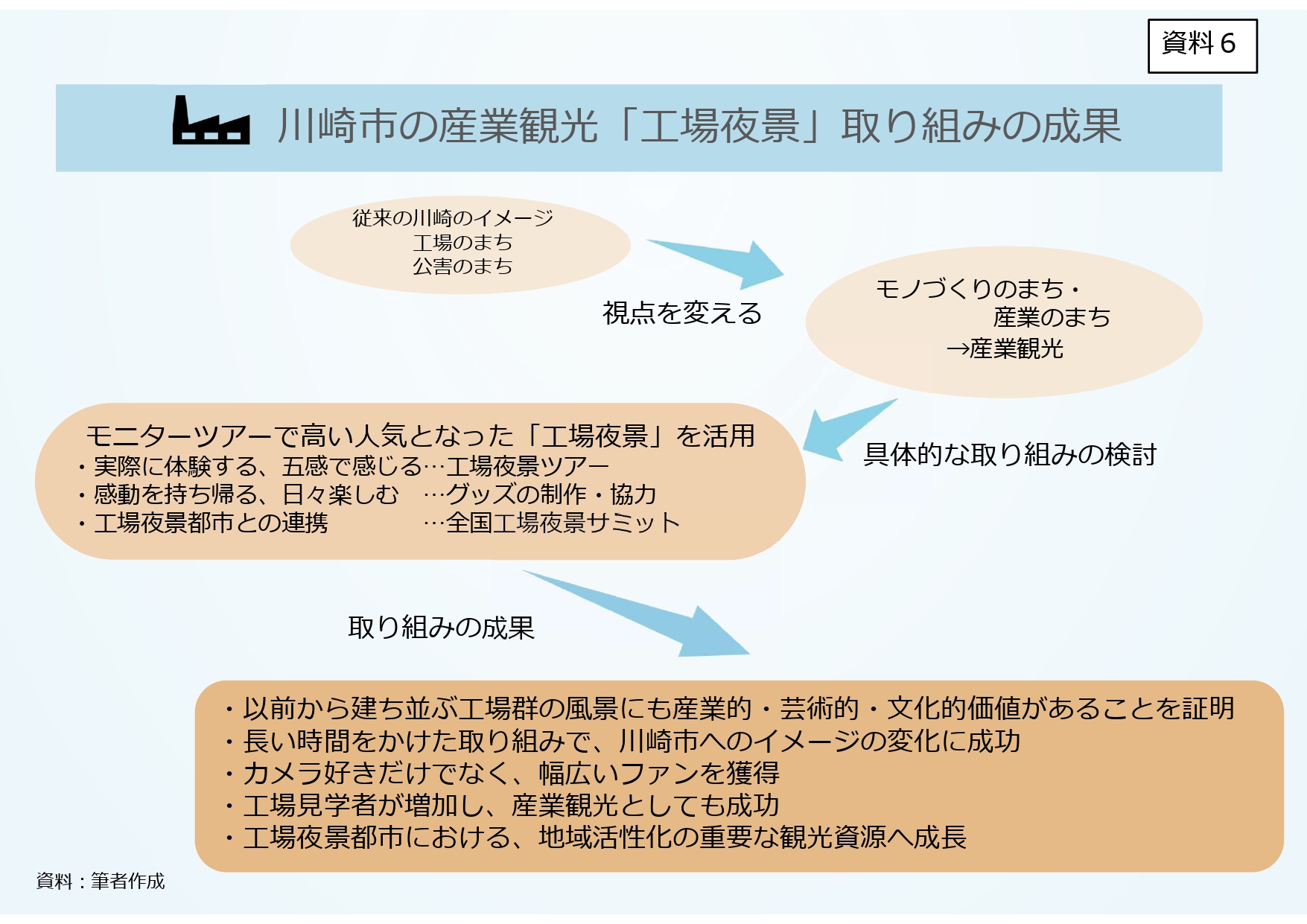 川崎市の10年以上にわたる取り組みは、川崎そして日本の発展に貢献してきた工業地帯への畏敬の念を感じさせる。その姿勢が、各事業所との良好な関係を築いていると考える。立入禁止施設への見学や、工場夜景サミット開催日の全点灯は、それを象徴するものといえよう*32 。工場夜景とともに、各事業所の知名度も上がり、工場見学者も増加しているという*33 。これは、自治体にしかできない取り組みの成果といえる[資料6]。