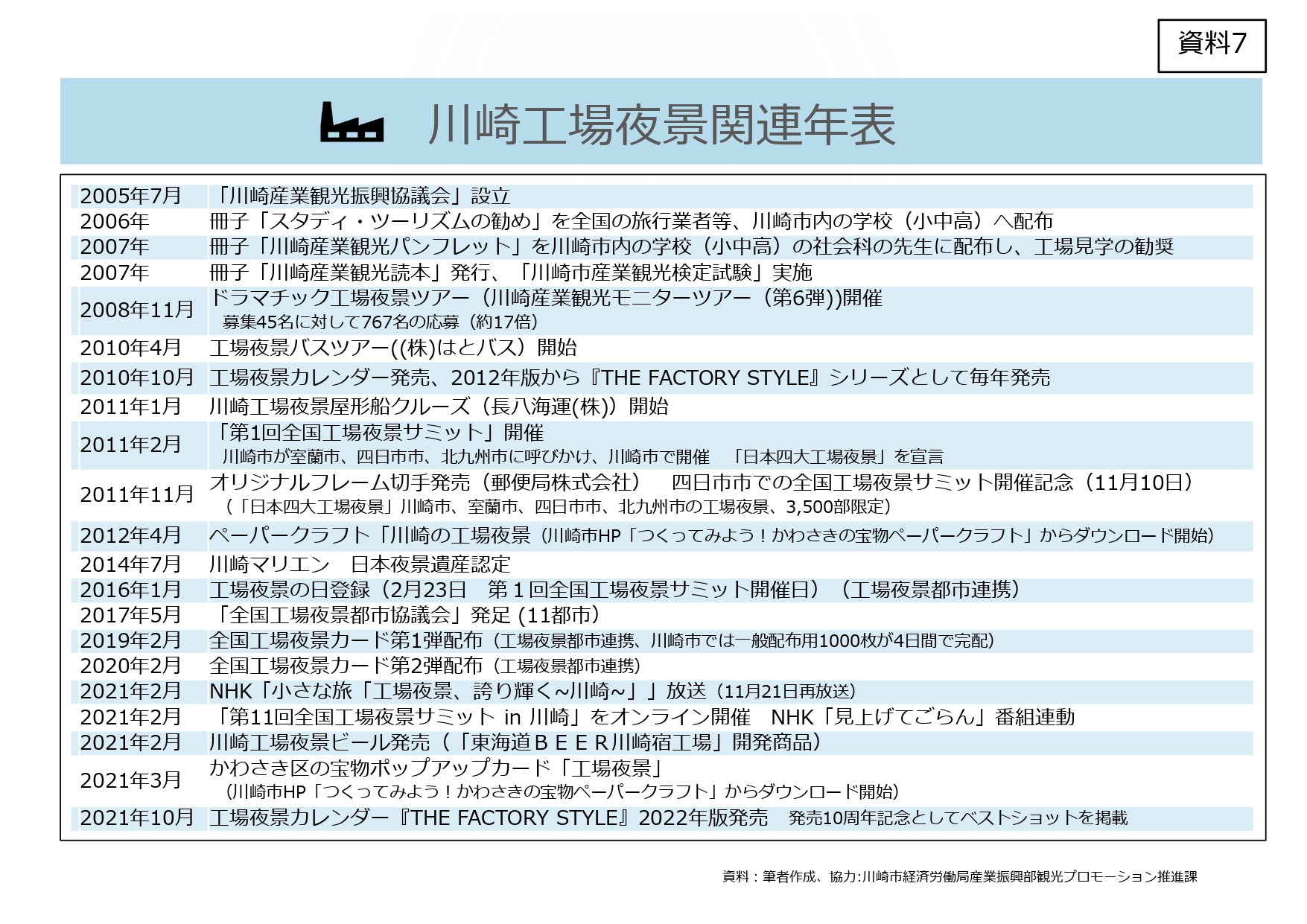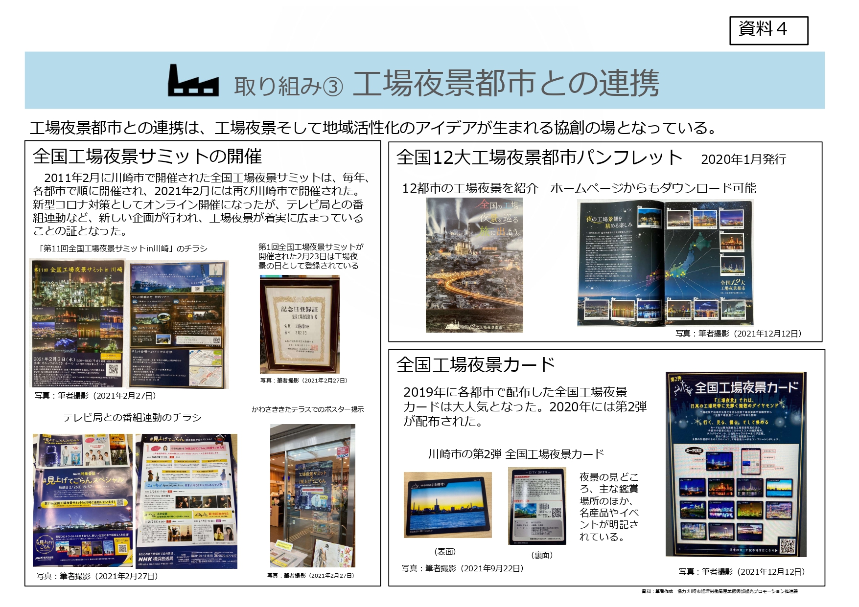 2011年2月23日、川崎市の呼びかけで、室蘭市、四日市市、北九州市とともに、「第1回全国工場夜景サミット」が開催された*25 。この場で、観光資源としての工場夜景のPRと、地域活性化の推進が決定された[資料4]。また、2016年には2月23日が「工場夜景の日」と登録された。現在では12都市が参加している*26 。特設ホームページ*27 による情報発信のほか、2019年に各都市で発行した「工場夜景カード」は、即完配となる都市もあった*28。