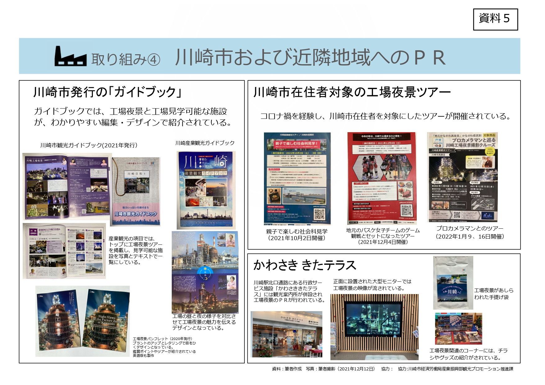 川崎市ではコロナ禍の経験をもとに、現在、川崎市在住者を対象にしたマイクロツーリズムにも力を入れている。川崎市のイチ押しと工場夜景を組み合わせたツアーは好評で、今後も継続されていくと考えられる[資料5]。また、川崎臨海部は羽田空港に近い立地から、インバウンド需要が期待できる。川崎市のPR動画*31 では、好意的なコメントが見られるため、コロナ収束を見据えた海外観光客向けツアーなどの検討は、有効と考える。