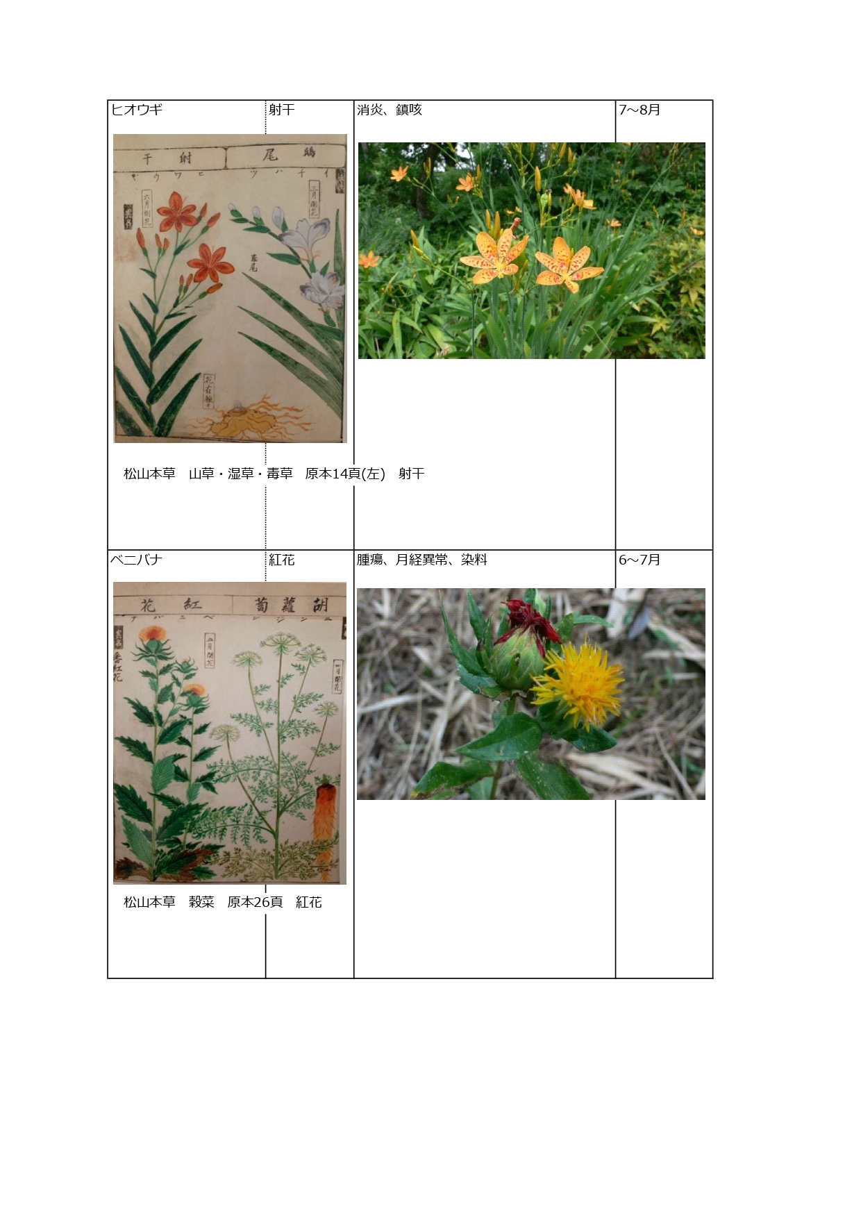 江戸時代、宇陀郡を始めとした大和の各地では、農家の副業として防風、地黄、当帰、芍薬といった薬草栽培が盛んに行われていた。その歴史事象を裏付けるひとつが、賽郭自筆の『松山本草』である。『松山本草』は、丁寧な観察に基づいて描写された薬用植物図譜で、門外不出の森野家至宝を、高橋京子氏(※4)が森野家協力の元、全巻電子化し全容を調査したものだ。「草上、草下、蔓草藤、芳草・灌木、山草・湿草・毒草、水草・石草、穀菜、木、鱗虫・禽獣、介」の10巻で構成され、1003種の動植物が詳しく描写されている。植物は地下部の薬用部位まで精密に描かれ、植物名や開花時期も付されているなど、写真や映像の無い時代の資料として大変貴重なものである。また、彩色された図譜は、非常に美しい。その内容は『大和本草』(※5)で薬類項目に分類された植物の80%以上に相当する(4)ことからも、江戸期以降の薬種、薬草栽培が確かに進められていたことが想像される。