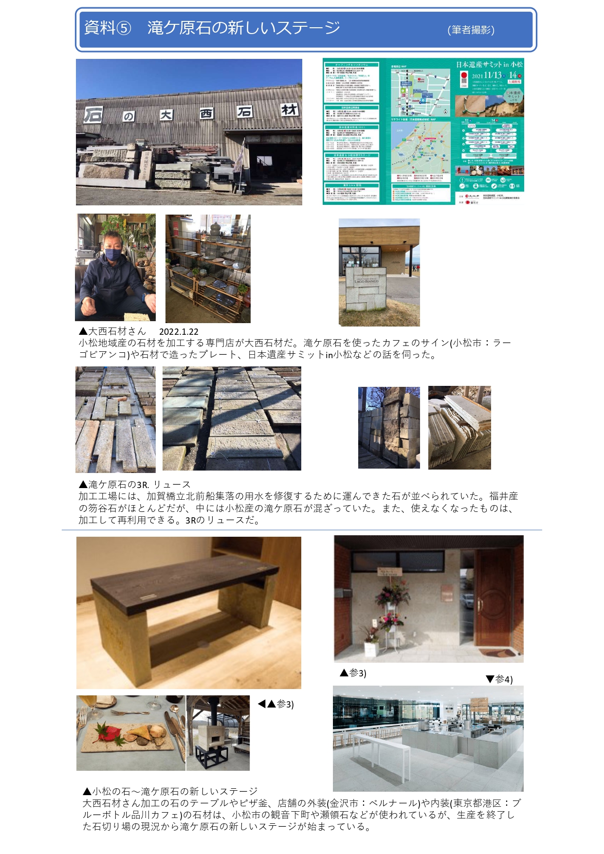 日本の石の文化の創造と発展に資するところがあった「こまつの石」の生産拠点は現在、滝ケ原の石切り場ひとつとなっている。石切り場はひとつとなってしまったが、石の歴史と伝統・文化をまもり、現代から未来へと発展していく新しいステージが始まっている。「日本サミットin小松」註10)、一般社団法人 こまつ観光物産ネットワークでの「こまつ まるごとストーンミュージアム」註11)、こまつ市唯一の石切り場商店註12)、こまつの石で家具などをつくる職人註13)滝が原町の暮らしを探求・創造するファーム註14)などだ。なかでも滝ケ原ファームは、滝ケ原石で造られた築80年の蔵を改装した宿泊施設もあり、滝ケ原石の文化を象徴するイベントやワークショップなども企画されている。町内外の交流の場は、若者も集う。滝ケ原の石の文化は、こうした若者からweb、インスタなどをとおし、共感を呼び、様々な人が訪れこれまでとは違う異次元の中で発展していくものと思われる。そうした活動に文化庁や小松市、滝ヶ原町などの市町村と生産者、大学が一体となり産学官民でこまつの石の文化が守られ、維持されることを期待する。