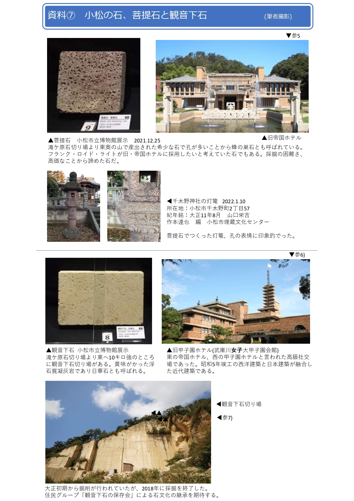 小松市の凝灰岩を代表する石に滝ケ原石のほか、菩提石と観音下石がある。菩提石は、小松市の凝灰岩のなかで最も不便なところで採掘された石だ。フランク・ロイド・ライトが帝国ホテルに使おうとしたが生産量と運搬などから諦め括ったといわれている。赤みと黄味を帯びた灰色で小さな孔が多いため蜂の巣石とも呼ばれており、深い斑紋が浮かぶ珍重な石だ。註7)観音下石は、ぬくもりのある黄色の石で国会議事堂や西の帝国ホテルと呼ばれた甲子園ホテル(現.武庫川女子大)、平城宮跡などに使用されている。大正初期に採掘が始まり、最盛期の昭和40年頃には町内に6軒の採石業者がいたが銘石の石切り場も2018年に採石を終了している。町内では、住民グループ「観音下石の保存会」が石切り場の見学用歩道整備に取り組み地域で協力して観音下の石文化を伝えている。註8)小松市の石は、滝ケ原石をはじめ、これら3種類の石と鵜川石、遊泉寺石など11種類の凝灰岩がある。註9)滝ケ原石を他の小松の石と比較して特筆する点は、➀江戸時代からの採掘が現在まで続いており生産の見通しが長期的にあること。②灰緑色がかった色が美しく上品であり文化・芸術的魅力が高い。③水に強く、目が細かくて耐久性が高いことから多用途に用いることができる。これら特筆できる点から滝ケ原石があらたな知見で人と文化をつなぐ道標となる可能性が高いことも特筆すべき点である。