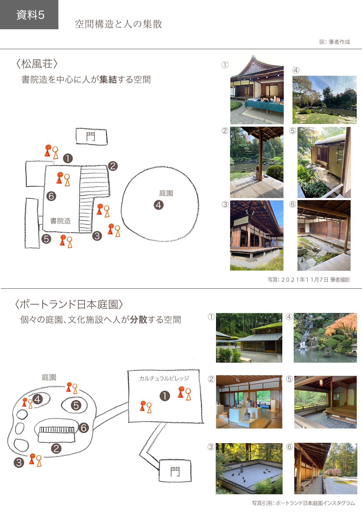 ポートランド日本庭園は小高い丘の上にあり、その庭園入口前の広場に、図書館、展示場、カフェを擁するカルチュラルビレッジを構える(15)。文化芸術活動は主にそこで行われ、目的別に十分なスペースが備わり、かつ、その意図は本命である庭園の静寂さを保つためである。一方、松風荘では書院造と庭園の中の目の届く敷地に限り、常に人と住まいを感じる環境で文化活動が行われている。よって、ポートランド日本庭園は分散、松風荘は集結、といった人と空間の特徴をもつ(資料5)。