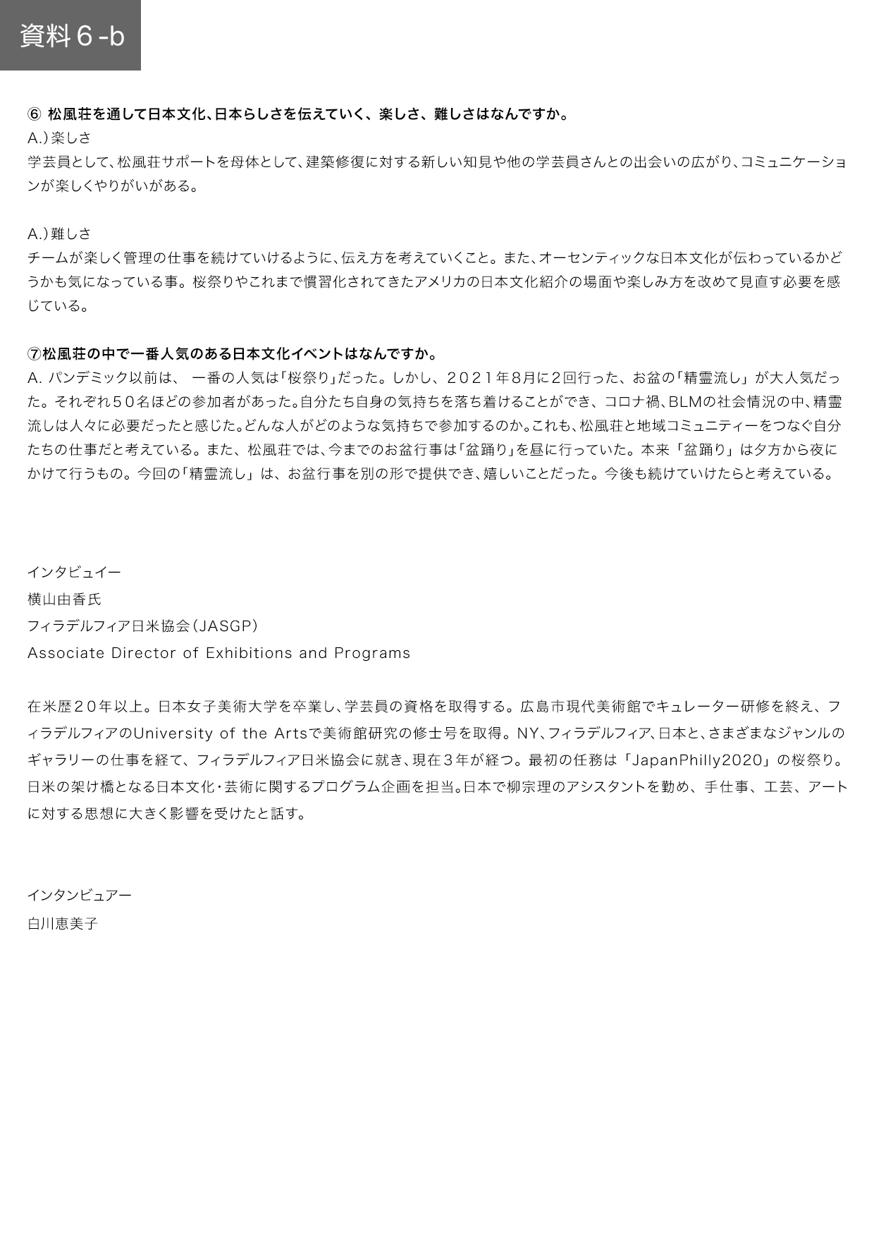 今後も松風荘の手入れの質を落とさず、さらに、スタッフとの意識確認や訪問客からのフィードバックを密に行っていくことが大切だ。また、人々のより新鮮な好奇心を求めるならば、地方性に目を向けることではないだろうか。日本文化の豊かさは多様な風土が生んだ地方文化の著しさに依る。隣の州ニューヨークには各都道府県の県人会が多く、間口は広く近い。地方の伝統芸術や文化の発信を担う人々と松風荘とが、意味あるつながりを深めることで、人々の日本文化への視野と関心は一層広まるだろう。それが、松風荘のモダンさと日本的な場所が潤滑に生き続ける1つの方法だと考える。