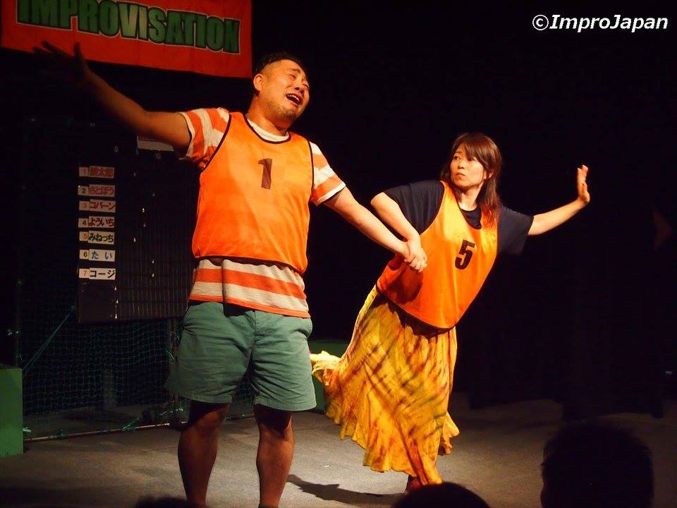 ショーの一場面。マエストロという個人対抗戦での一コマ。個人対抗であっても、インプロはひとりで演じることはほとんどなく、くじ引きで数名ずつが選ばれ、短いシーンをつくる。ゼッケン1番はこのときの優勝者であり、5番が筆者である。