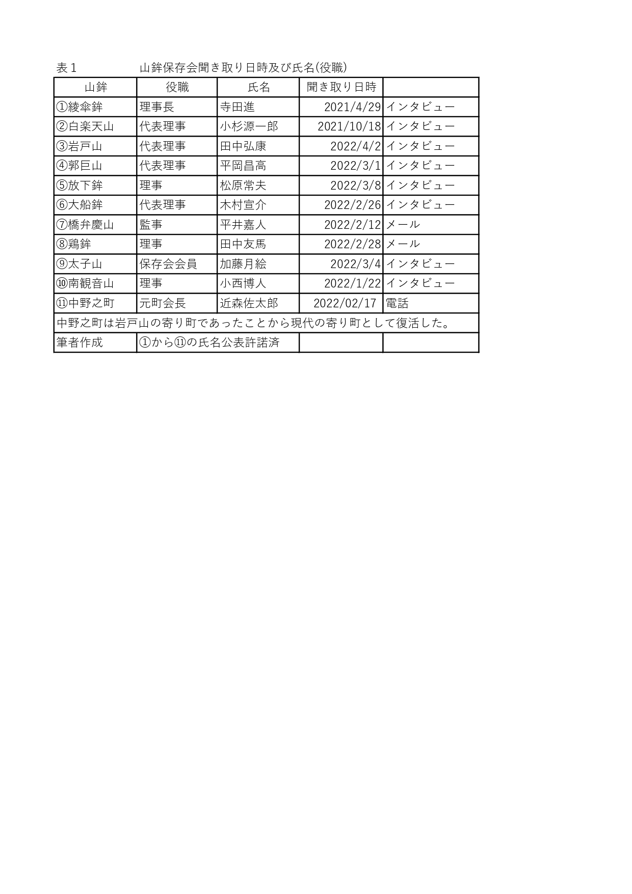 表1 山鉾保存会活動聞き取り調査表、山鉾名、日時、聞き取り先氏名(氏名公開了承済)