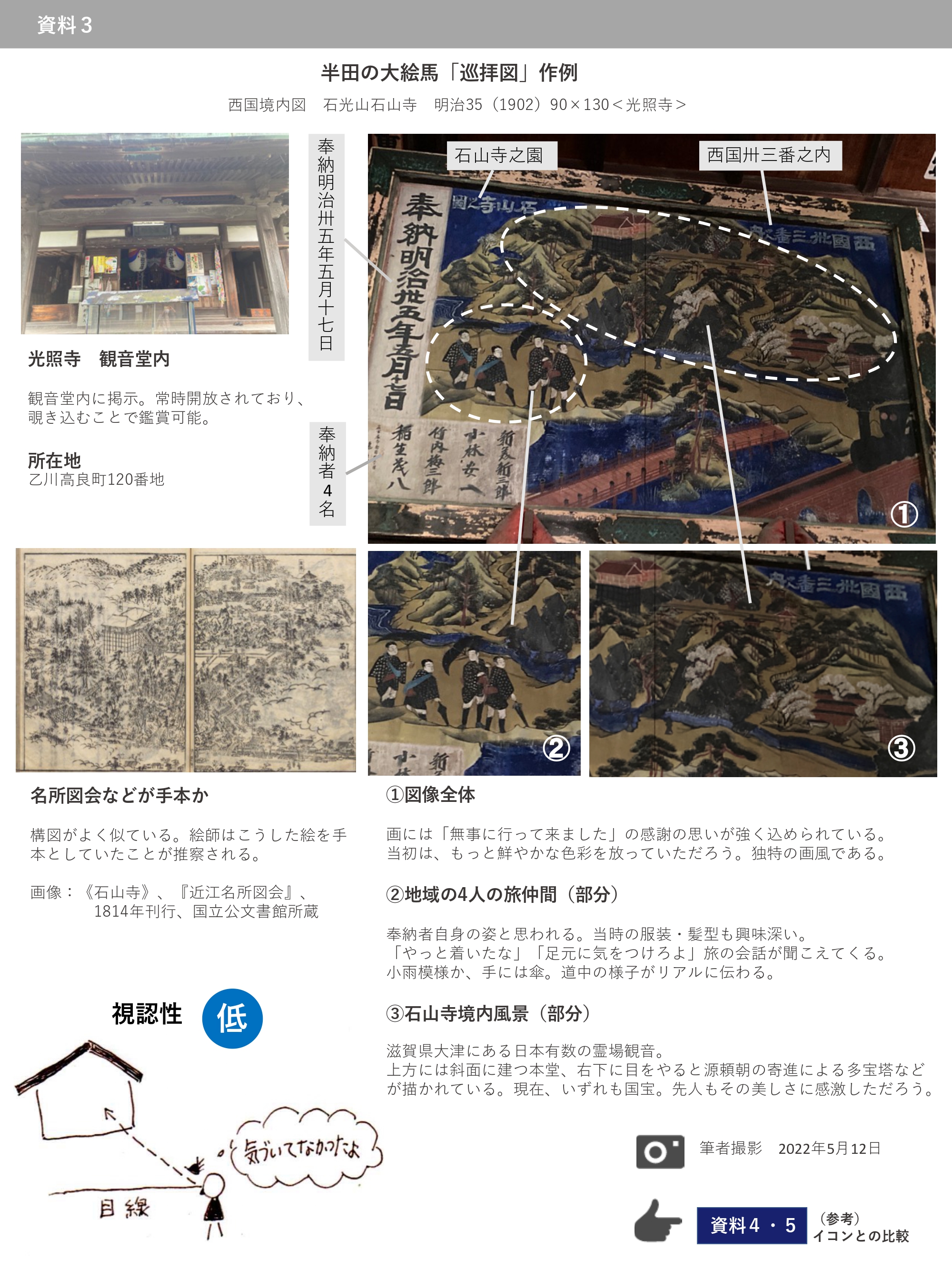 数多く遺る「巡拝図」には、長谷寺・石山寺など巡礼各地を象徴する建物・風景が描かれている。画に多様な「地域色」を捉えることができ、風景版画で名高い歌川広重の「東海道五十三次」や幾多の名所図会を彷彿とさせる(19)。地域ごとの抒情を伝え、訪れたことのない地への憧れや郷愁を抱かせる点は、これら名画に並ぶ。