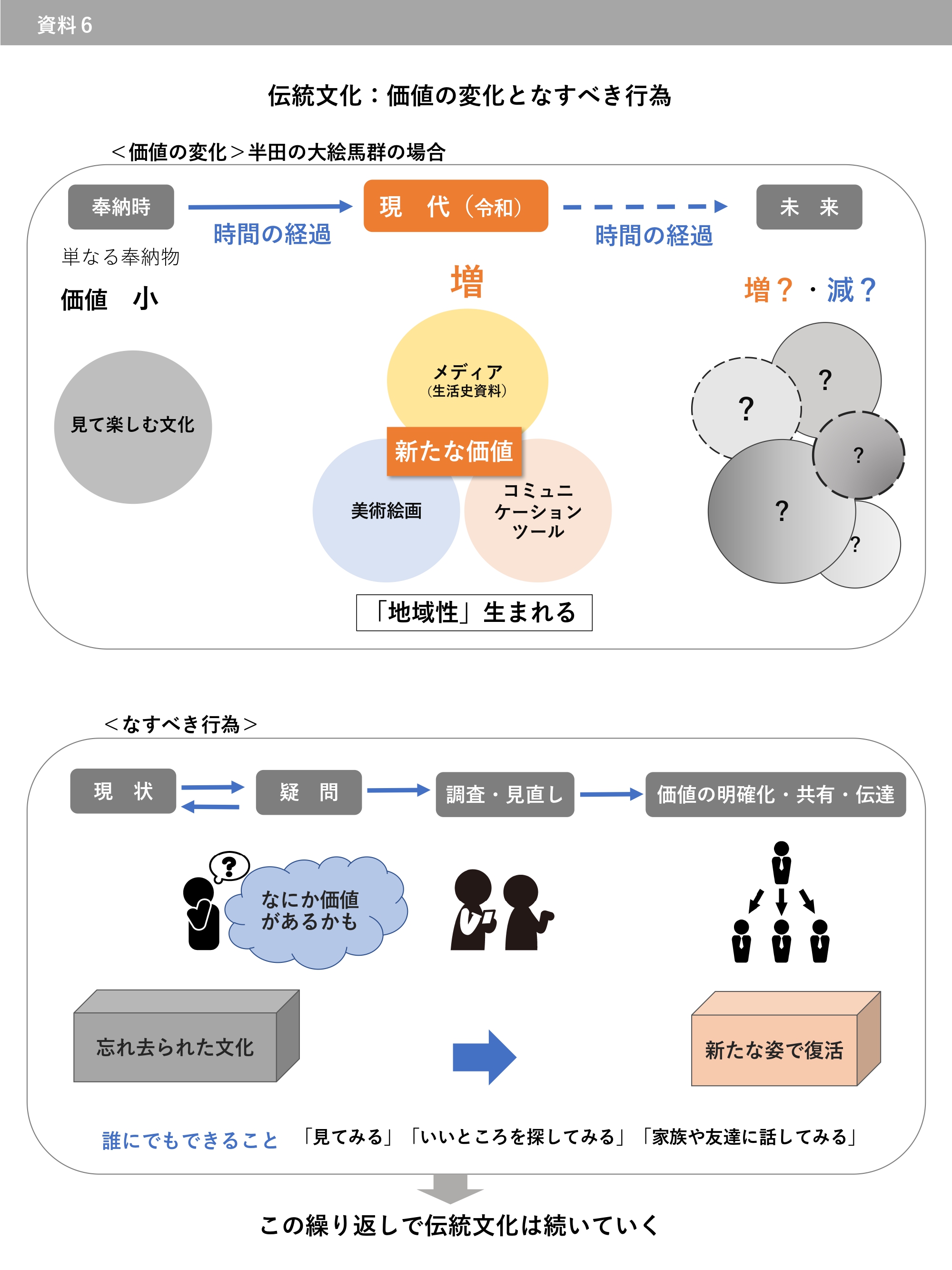 伝統文化の価値は時間の経過・時代の変容に伴い変化する。忘れ去られる文化があるのもやむを得ない(29)。だが「現在の視点」から見つめ直し、情報を整理し、時代に合った意味づけをすることで新たな価値が生まれることもある(資6)。本調査・考察はその証明に挑んだものであった。