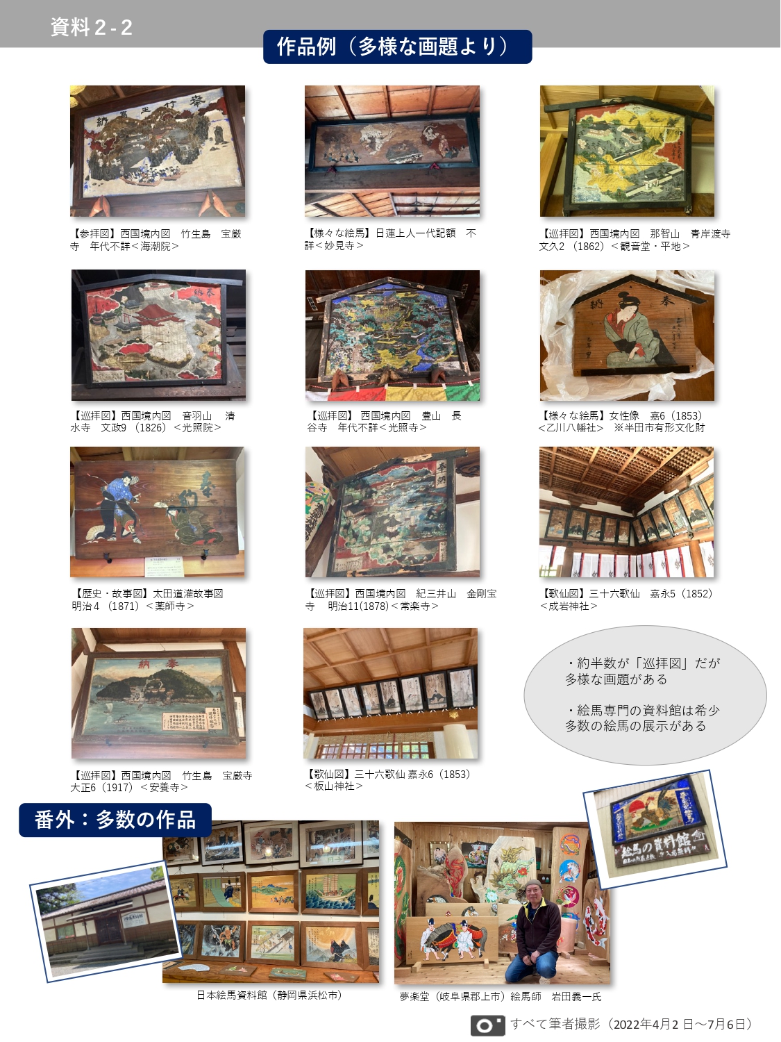 (2)大絵馬が現存する半田市内の寺社(計18ヶ所)を調査。大絵馬の現況確認、住職・宮司などへの聞き取りを行った(うち12ヶ所は対面、不在寺社6ヶ所は電話による取材)。加えて、日本絵馬資料館(静岡県浜松市)・夢楽堂絵馬資料館(岐阜県郡上市)への訪問調査、現役絵馬師・地域の高齢者などへの聞き取りも行った。