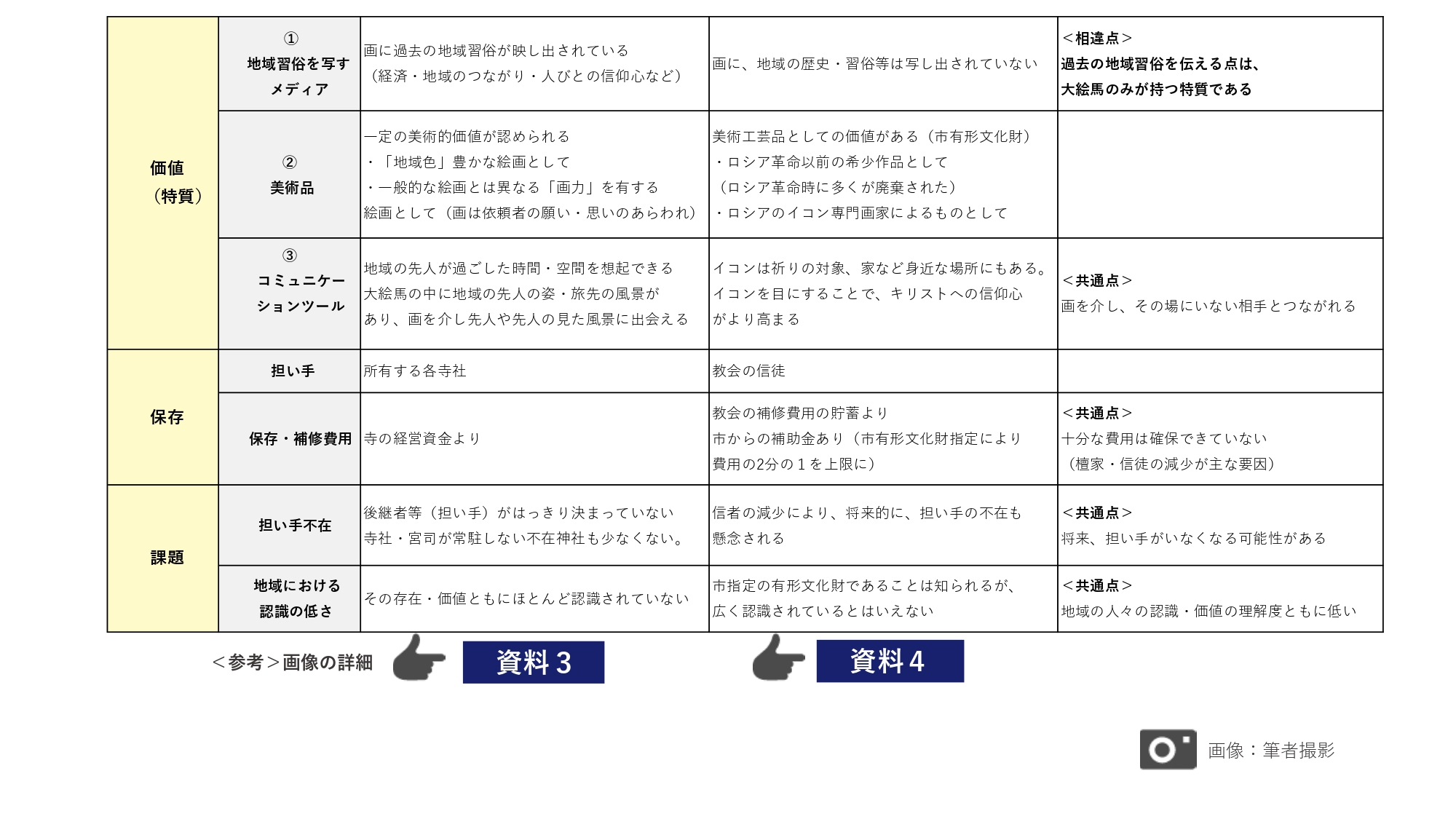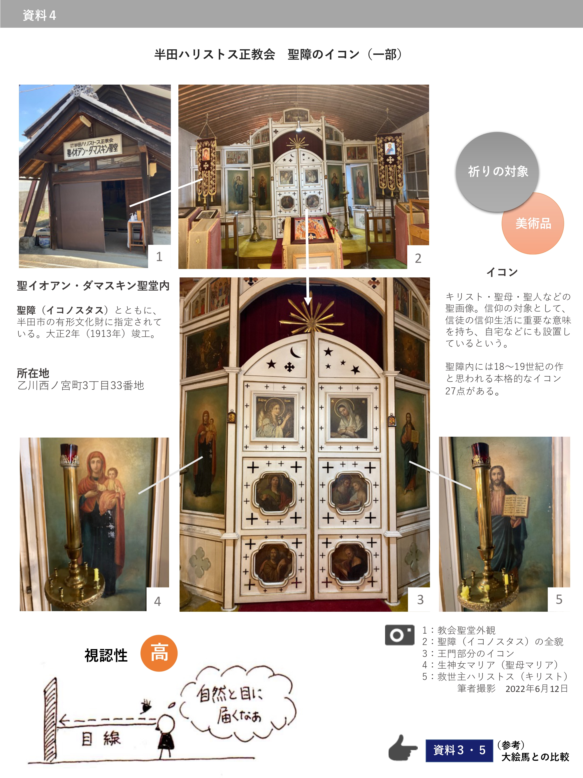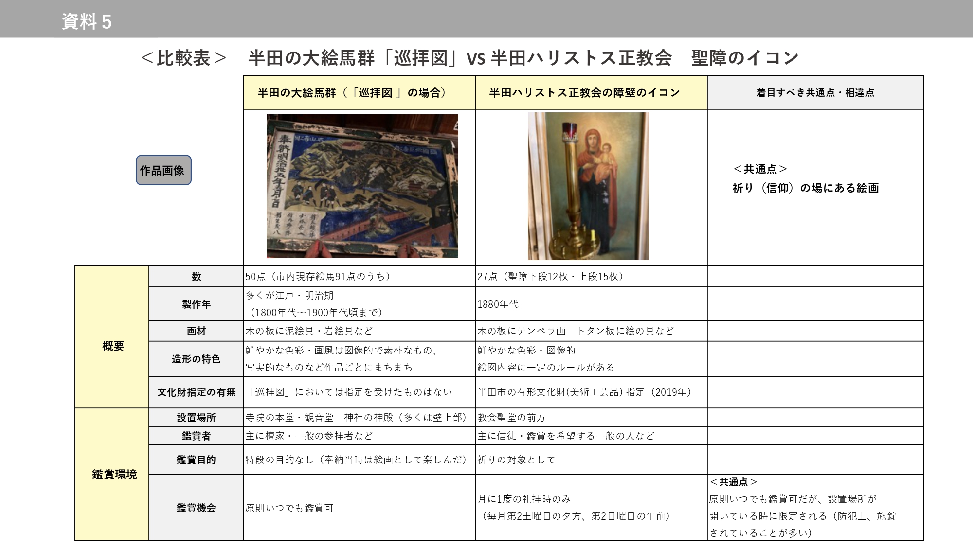「地域の祈りの場にある絵画」という共通点、岩田氏の「絵馬はイコン」の言葉から、半田ハリストス正教会のイコンと比較する(資4・5)。専門画家による写実的な筆致を有するイコンは、美しく厳かで、芸術的側面の比較に置いて大絵馬群に優る。遠い相手とつながるツールである点は両者共通するが、地域の習俗の記録という資料性や地域性はイコンには見られない。大絵馬独自のこの性質こそが特筆点であり、継承していく最大の意義はこの点にあろう。古い習俗を知る長老がいなくなりつつある今、地域研究の場などでの活用が大きく期待される。