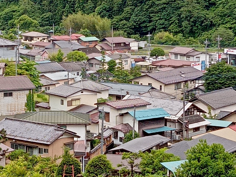 画面手前の集落は10組で、元は田んぼだった。1990年代に造成して宅地にし、温泉集落の中から、国道17号沿いの地の利を求めてここに移動した店(饅頭屋、美容院、など)がある。「農村地域型」のコミュニティ(註11)である。