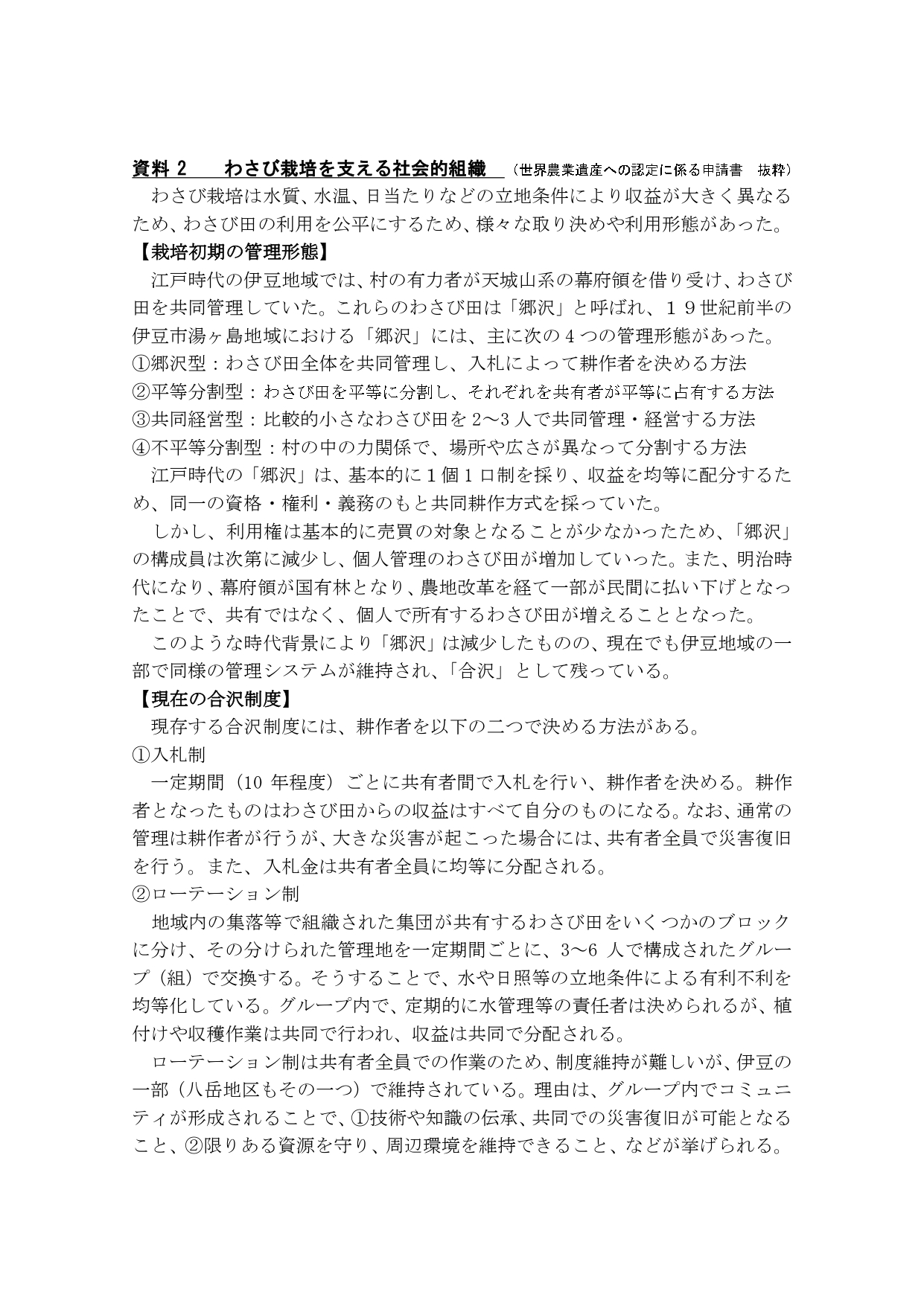 特筆すべきは、源平川の活動が、景観保全を最大のテーマとしているに比べて、本活動は、400年にわたり生産活動として営々と営まれてきた生産地としてのわさび田が、結果として地域に根付く景観を形成しているという点である。近世、近代の時代を通して「畳石式わさび田」という工法が維持され、次世代に受け継がれたのには、合沢制度等にみられる共同管理システム(資料2)の構築がある。わさびそのものの魅力と「畳石式」が生み出した高品質のわさびが商取引の対象となり、結果として生産者の生産意欲に繋がった。しかし、定期的な改田等の作業は重労働であり、一個人では対応ができない。そこで当該地域では、共同管理システムを構築し、地域の持つ協力関係によりこの問題を乗り切ってきた。この共同管理システムこそ、現在に美しい農村景観を伝える原動力となった。