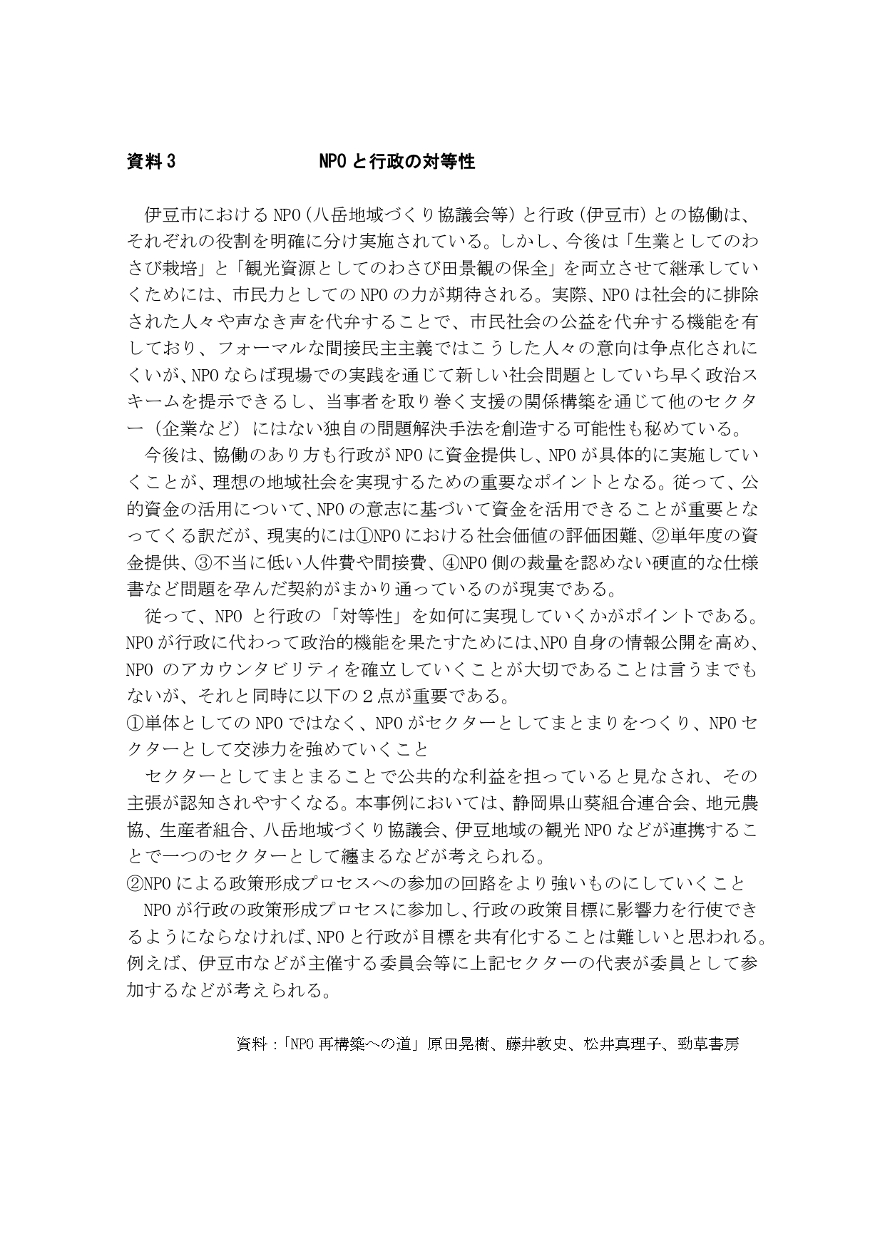 伊豆市では、NPO(八岳地域づくり協議会等)と行政(伊豆市)との協働における役割が明確に分けられている。しかし、今後は「生業としてのわさび栽培」と「観光資源としてのわさび田景観の保全」を両立させて継承していくためにも、市民力としてのNPOの力が期待される。今後は、行政がNPOに資金提供し、NPOが具体的に実施していくといった協働のあり方が、理想の八岳地区を実現するためには重要なポイントとなる。そのためにも、NPOが行政と対等(資料3)に対峙できることが必要で、源平川におけるグランドワーク等の中間NPOのあり方を参考にしつつ活動する必要がある。
