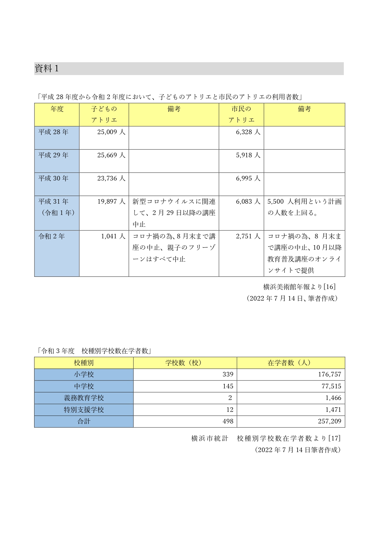 (資料1)「平成28年度から令和2年度において、子どものアトリエと市民のアトリエの利用数」 (2022年7月29日筆者作成)「令和3年度 校種別学校数在籍者数」(2022年7月29日筆者作成)