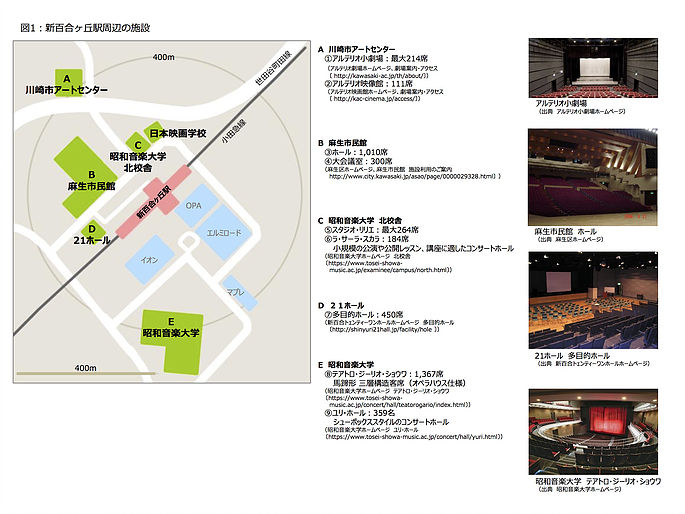 開催地「麻生区」は1982年に誕生した川崎市で最も新しい区で、東京のベッドタウンとして発展した住宅街である。区中心に位置する小田急線「新百合ヶ丘」駅周辺には、区誕生当初から昭和音楽大学(以下、昭和音大)サテライトキャンパスや日本映画学校、大ホールを有する麻生市民館があり音楽活動を行う好立地で、1986年に区民手作りの「麻生音楽祭」が始まる。1994年に市が麻生区地域を対象に「芸術のまち」構想を発表し、「芸術」をキーワードにまちづくりが進められ「KAWASAKIしんゆり映画祭」、「あさお芸術のまちコンサート」が開始。2007年には昭和音大本校舎が駅前に移転、同年に川崎市の芸術振興拠点として川崎市アートセンター※4 が開設される。このように新百合ヶ丘駅徒歩5分圏内に9つのホールや劇場が集積され※図1 音楽・演劇関係者が集まり芸術環境が整備された。また、区内には市民音楽団体が多数存在し、音楽文化が住民に定着している。