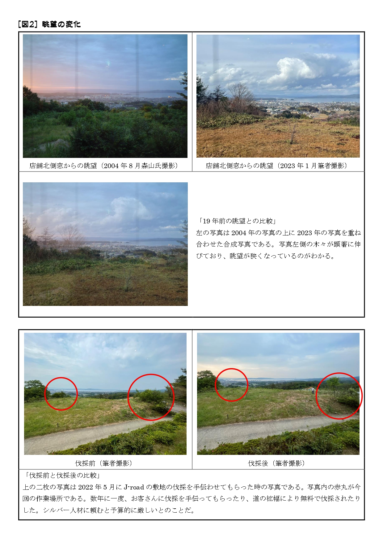J-Roadはこのような眺望をカフェの付加価値とした。眺望は生き物である。周りの木々が伸びてくれば視界が狭くなる。眺望を守るために伐採なども自分たちやお客さんに手伝ってもらいながら作り上げてきた(図2参照)。
