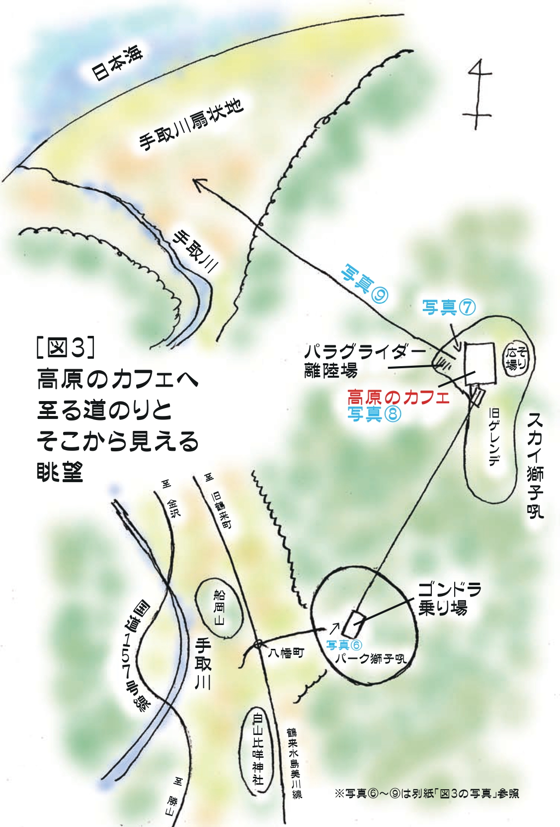 両者の比較から半公共経営でゴンドラやパラグライダーの離陸など大掛かりな非日常の驚きを提供し手取川扇状地という眺望を守ってきた高原のカフェに対して、個人経営で車という日常の手段を使い、山道と店舗の作りによってもたらされる驚きにより眺望を守ってきたJ-Roadという差が読み取れる。個人経営でも工夫次第で公共と同じように眺望を守ることが出来ているという特筆性が見えてくる。