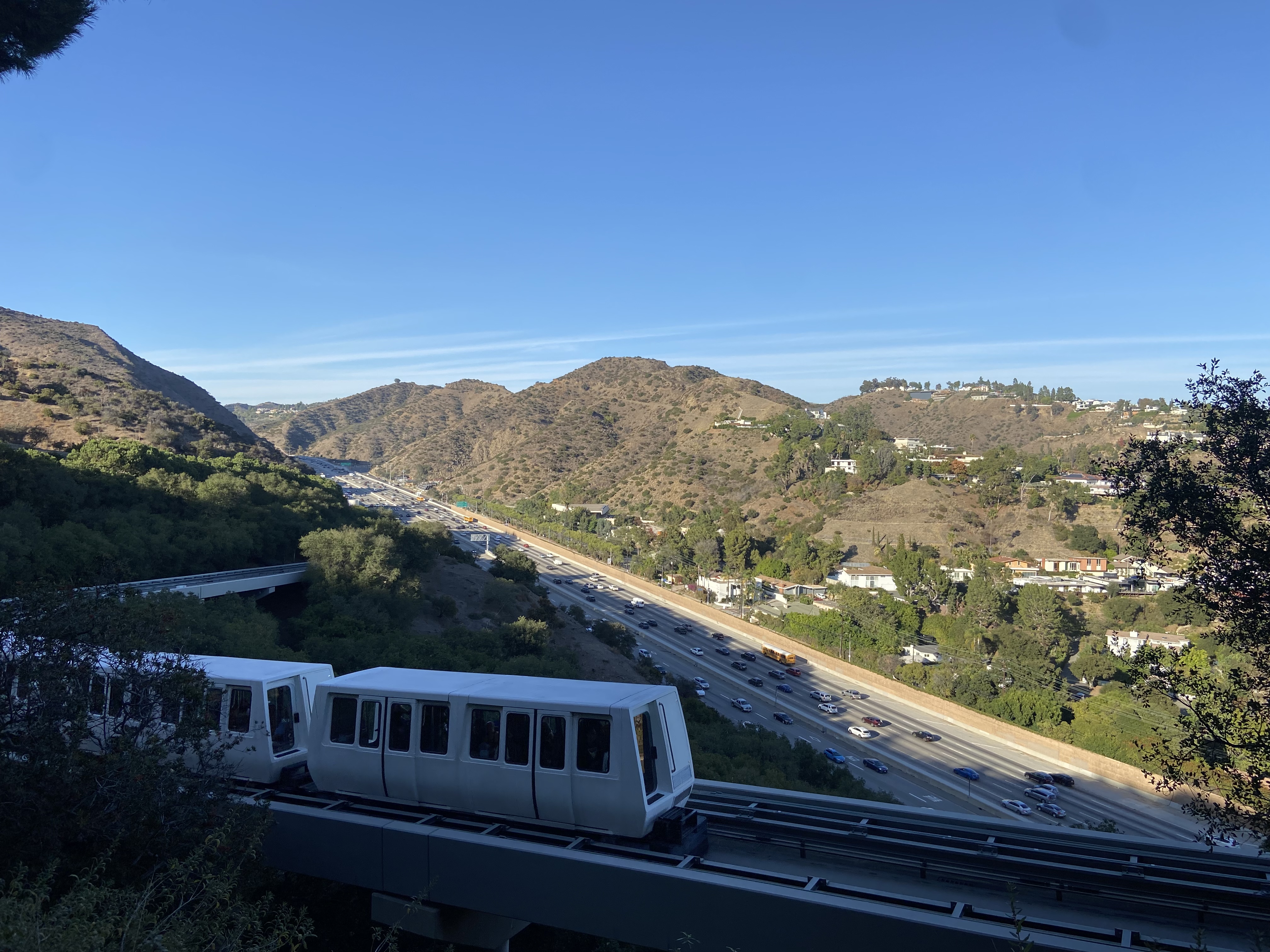ゲティ・センターは、白を基調とした建築で有名なアメリカの建築家リチャード・マイヤーによって設計された。ル・コルビュジエ(Le Corbusie,1887~1965)の影響を大いに感じさせる当建築は、彼の最高傑作のひとつとも言われる(3)。丘下にある駐車場を降りると、真っ白なトラムと屋外彫刻が出迎えてくれる[画像3]。トラムに乗り込み緑の丘を登っていくと、窓からはロサンゼルスの街が一望できる。3分に満たない時間であるが、勾配を登るにつれて期待が高まる演出となっている。