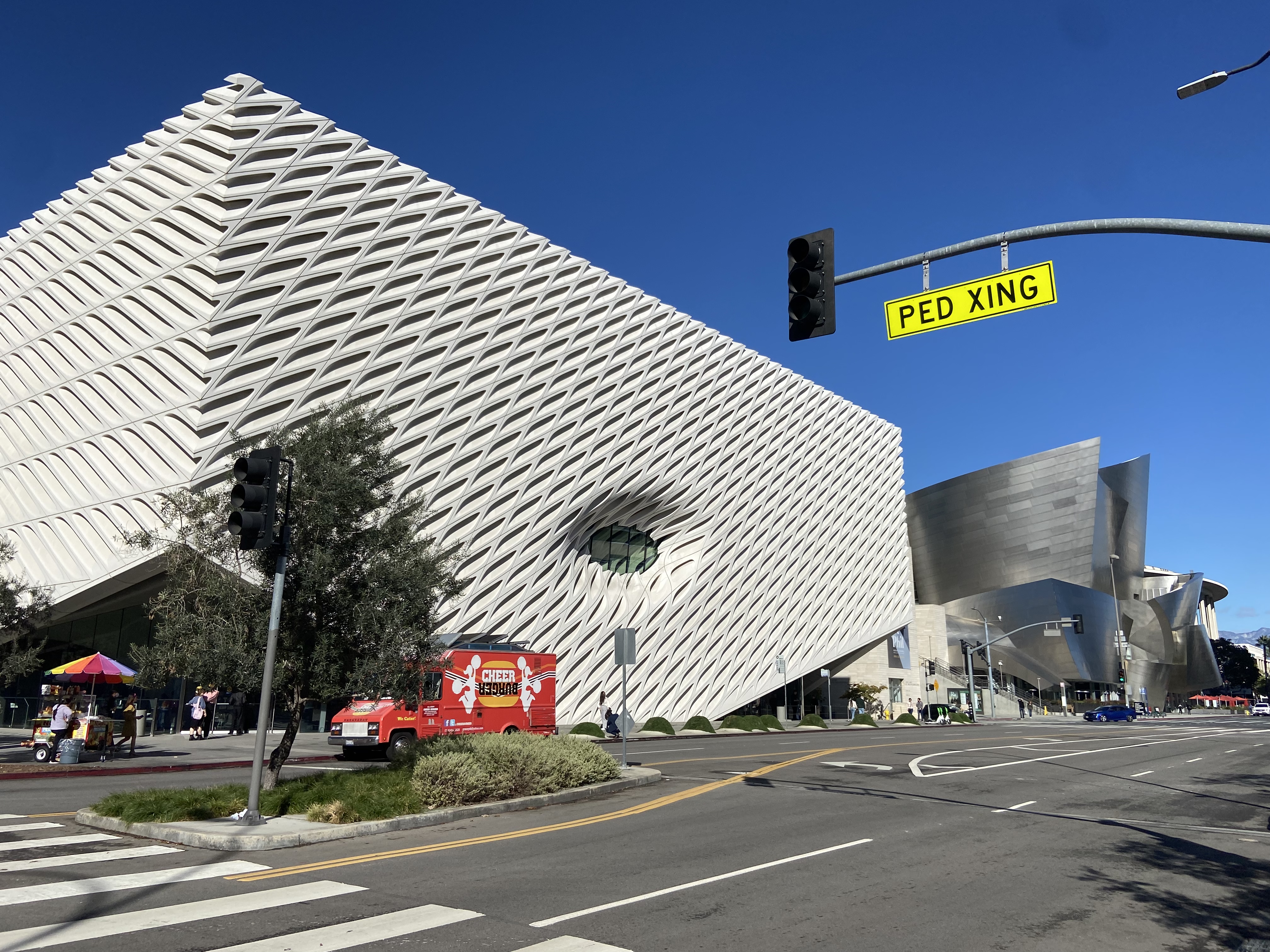 丘上にある白い駅舎に到着し10mほど歩き左側を向くと、白とブロンズの彫刻を配した階段の先に、白い曲線的な建物に直線的なグリッドタイルを配した美術館が現れる[画像4]。カリフォルニアの青空に映えるその様は何度行っても写真を撮りたくなるほど美しい。