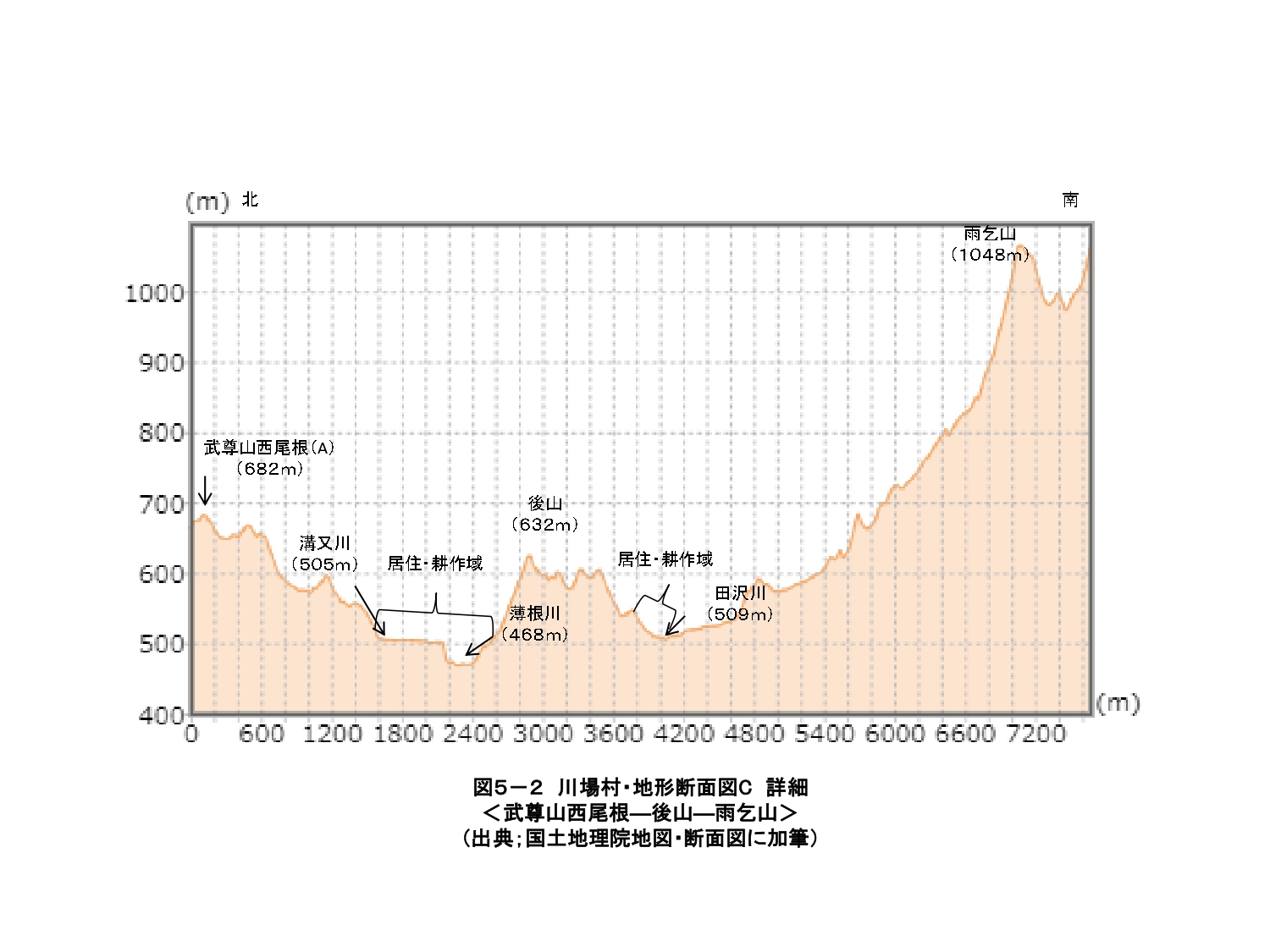(3)(北)武尊山(ほたかさん標高2,158m)、(西)高手山(たかてやま、標高1,374m)、(中)朝倉山(あさくらやま、標高1,289m)、(東)雨乞山地(あまごいさんち、標高1,068m)などに囲まれている。役場の標高535m。耕地の平均勾配2%。