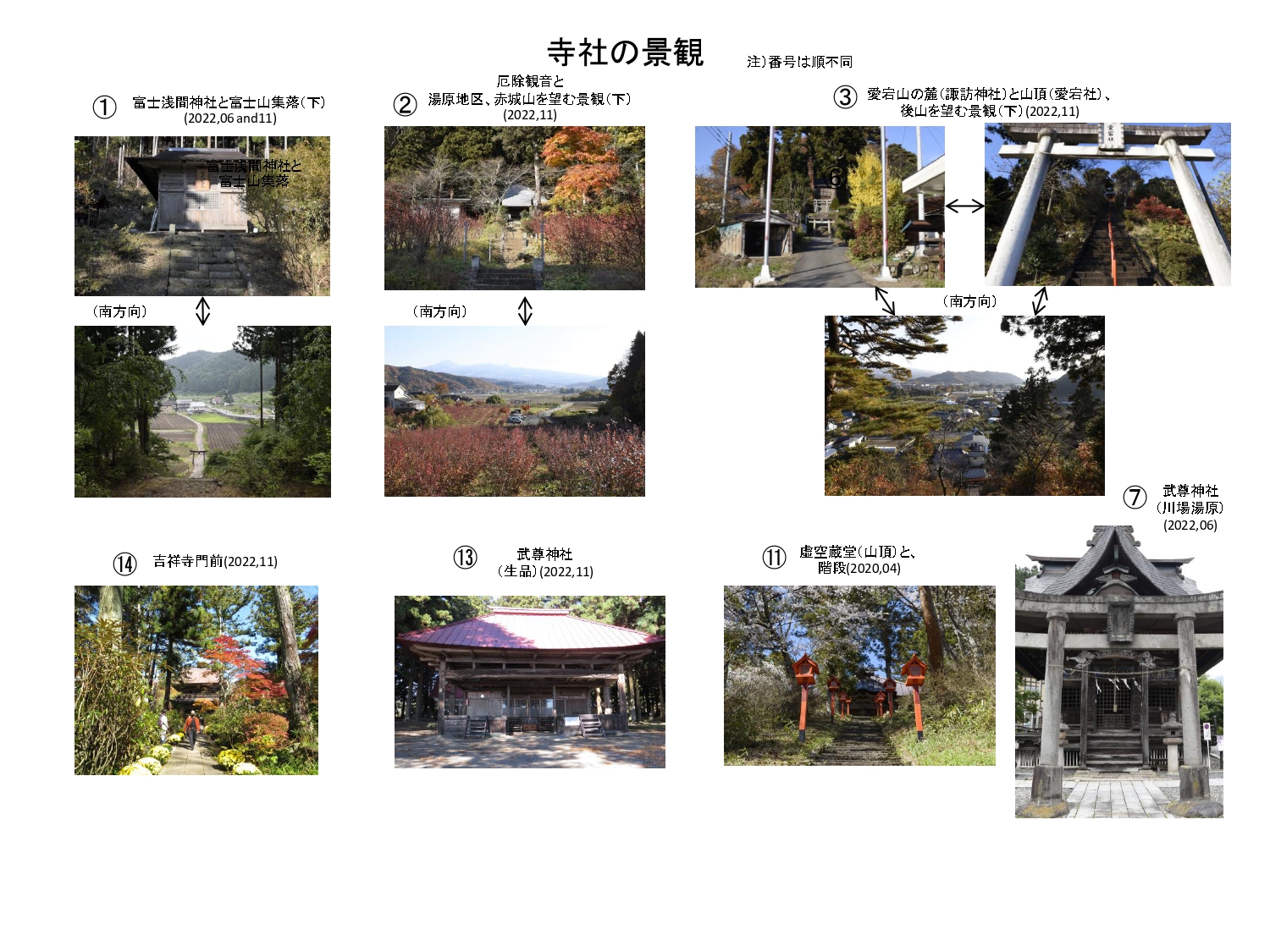 村の総面積の83%は森林で、耕地面積は僅か7%である。背後に聳える武尊山は日本書紀の日本武尊(13)にその名が由来し、森の恵みで命を支える存在として古代より人々が崇めた信仰の山である。その尾根が平坦部に転化した場所に、複数河川(14)が扇状地と河岸段丘を形成する。南北約6km、東西約3km、高低差約150mの平地に広がる耕作地と、周辺に点在する集落(8地区)が川場の里山景観を生む。朝倉山端部から南を望むと、近景に水田や果樹園、中景の左右両翼に尾根、その両裾野を流れる川の合流付近に景観を引き締める後山(15)がある。さらに遠景の左に赤城山、右に子持山の稜線が浮かび、その先の世界へ想像力を掻き立てる空間構造である(16)。各集落には寺社が祀られる。樋口忠彦(17)の景観工学に基づく類型では、川場全体の景観は典型的な「水分(みくまり)神社」型(18)である。人々の暮らしにやすらぎを与え、心の“ふるさと”を代償できる景観で、代表的な日本の原風景とされる(19)。