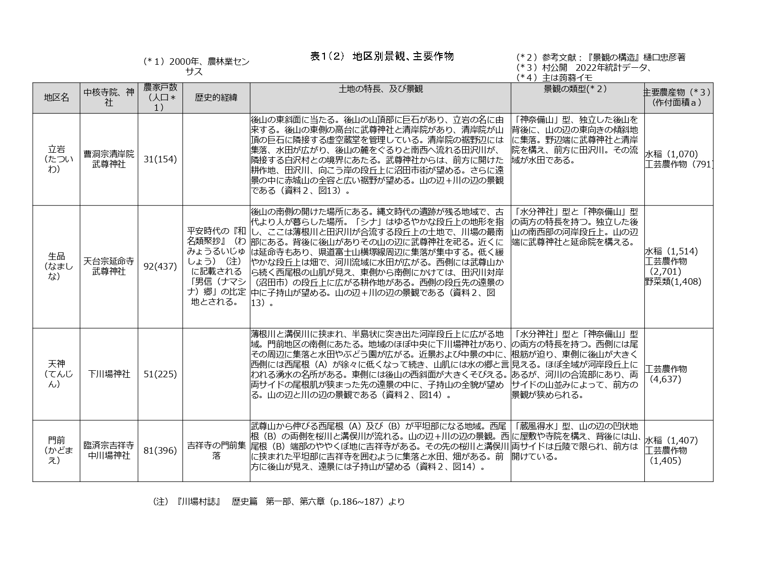 武尊山域の民有林は約40%で、この山は生活支える重要な林地である。古くは木材のみならず、狩猟、農耕馬や牛がいた時代には秣場、茅葺屋根の茅場、炭焼きや薪燃料、山菜など食材の供給地でもあった(21)。その後1960年代に輸入木材の自由化やエネルギー転換などの影響で山林需要が低下し荒廃したが、高度成長期以降、特に近年はCO2排出量規制などの要求で山林の重要性が再認識されている。川場では、東京世田谷区との交流事業(22)を通じ、森林の保全育成や景観維持を果たしてきた(23)。一方、農地は扇状地上に広がる。細長く狭い地形の中に4本の一級河川が潤す土地は稀であろう。江戸時代の開墾(24)で耕地が拡大し、現在は水利の効く平地及び段丘下の河川流域に水田が、水はけのよい段丘上には畑(かつて桑、現在は蒟蒻イモが主)が広がり、尾根端の山の辺にはリンゴやブルーベリー、ぶどうなどの果樹が栽培される。多様な農産物が土壌の質に応じて効率よく育てられ、土地の表情は豊かである。地区別の景観、主要産物などを添付で示す(25)。