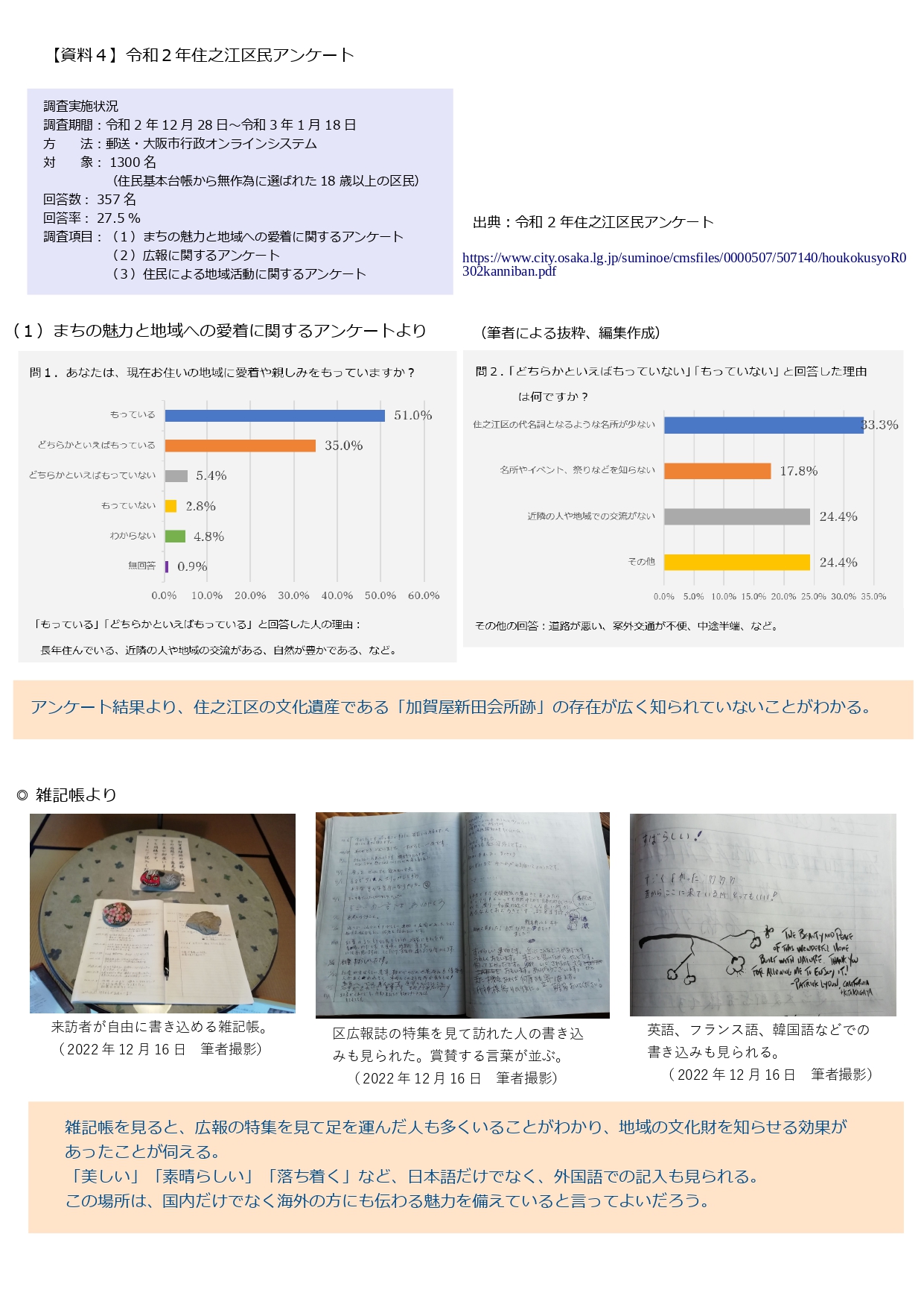 また、令和2年に実施した区民アンケート(10)によると、住之江区に愛着や親しみをもっている・どちらかといえばもっていると答えた人は合わせて86%いるのに対し、どちらかといえばもっていない等と答えた人のうち、その理由の半数以上に「代名詞となる名所が少ない。」「名所やイベントなどを知らない。」が挙げられた。【資料4】