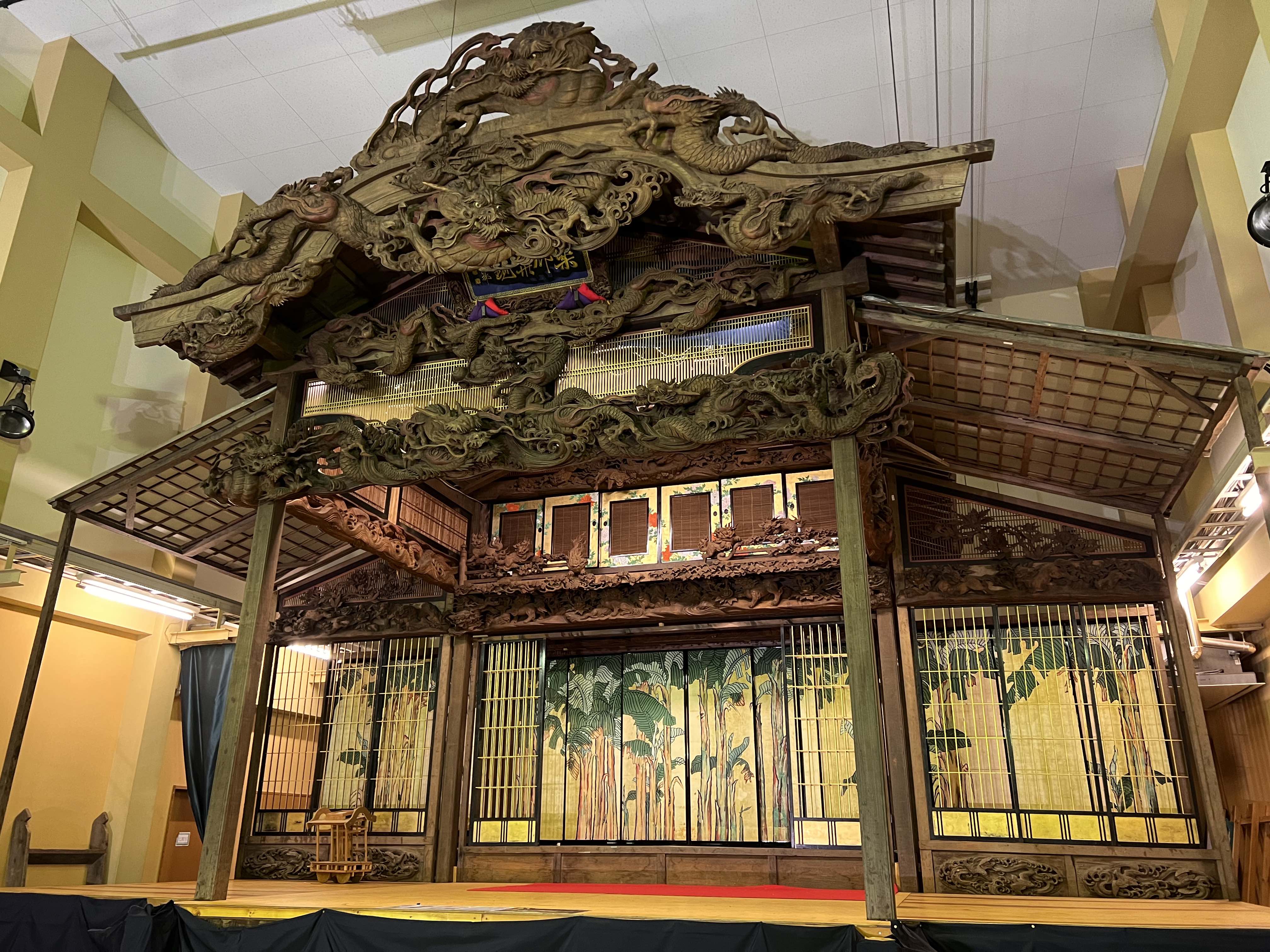 正面二本の龍柱には、昇龍と降龍、下座には獅子、牡丹、栗鼠、葡萄、鶴などの彫刻が施され、大小100個の部材で組み立てられている。
