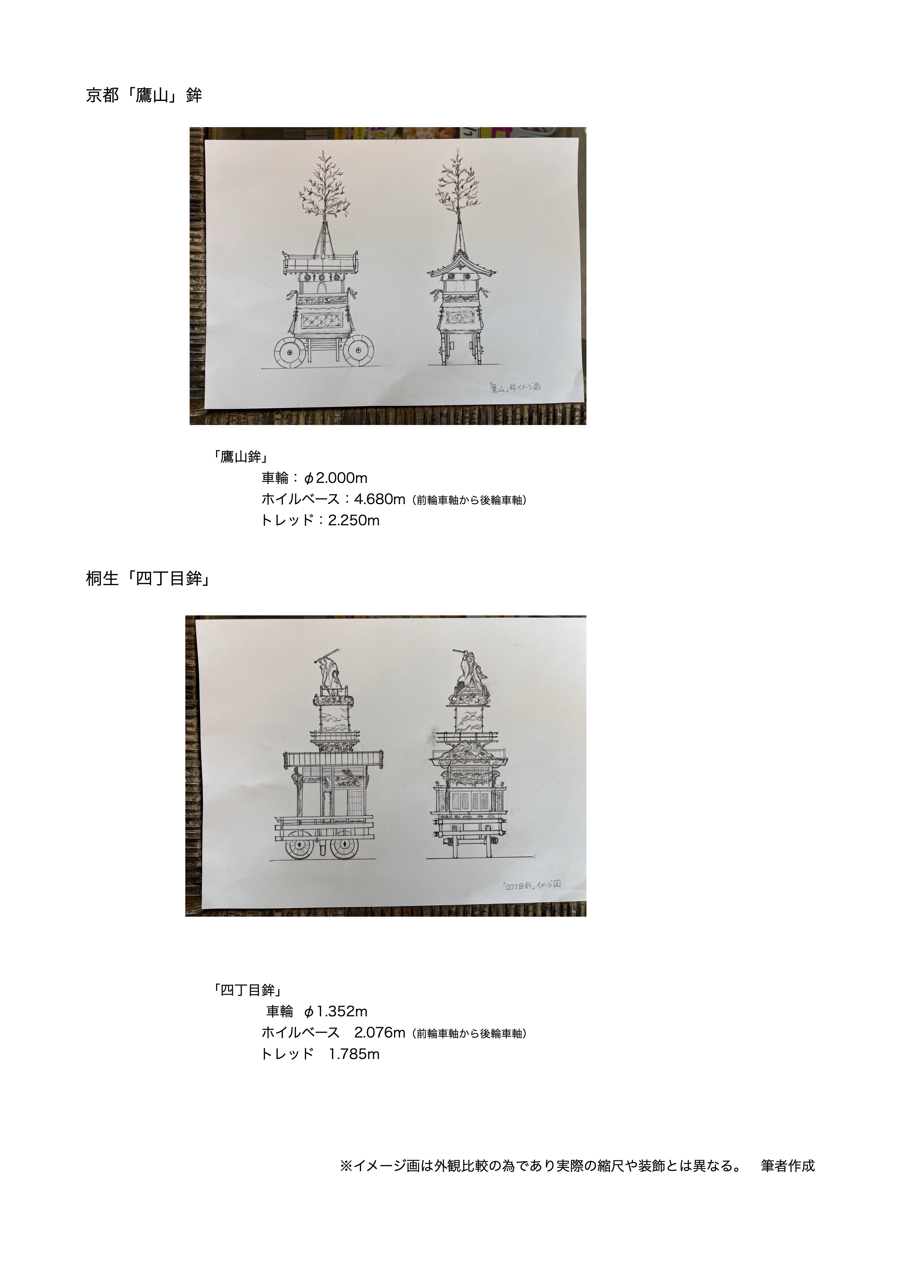 車輪直径、ホイルベース、トレッド、寸法比較と鉾の外観比較【引用1】。