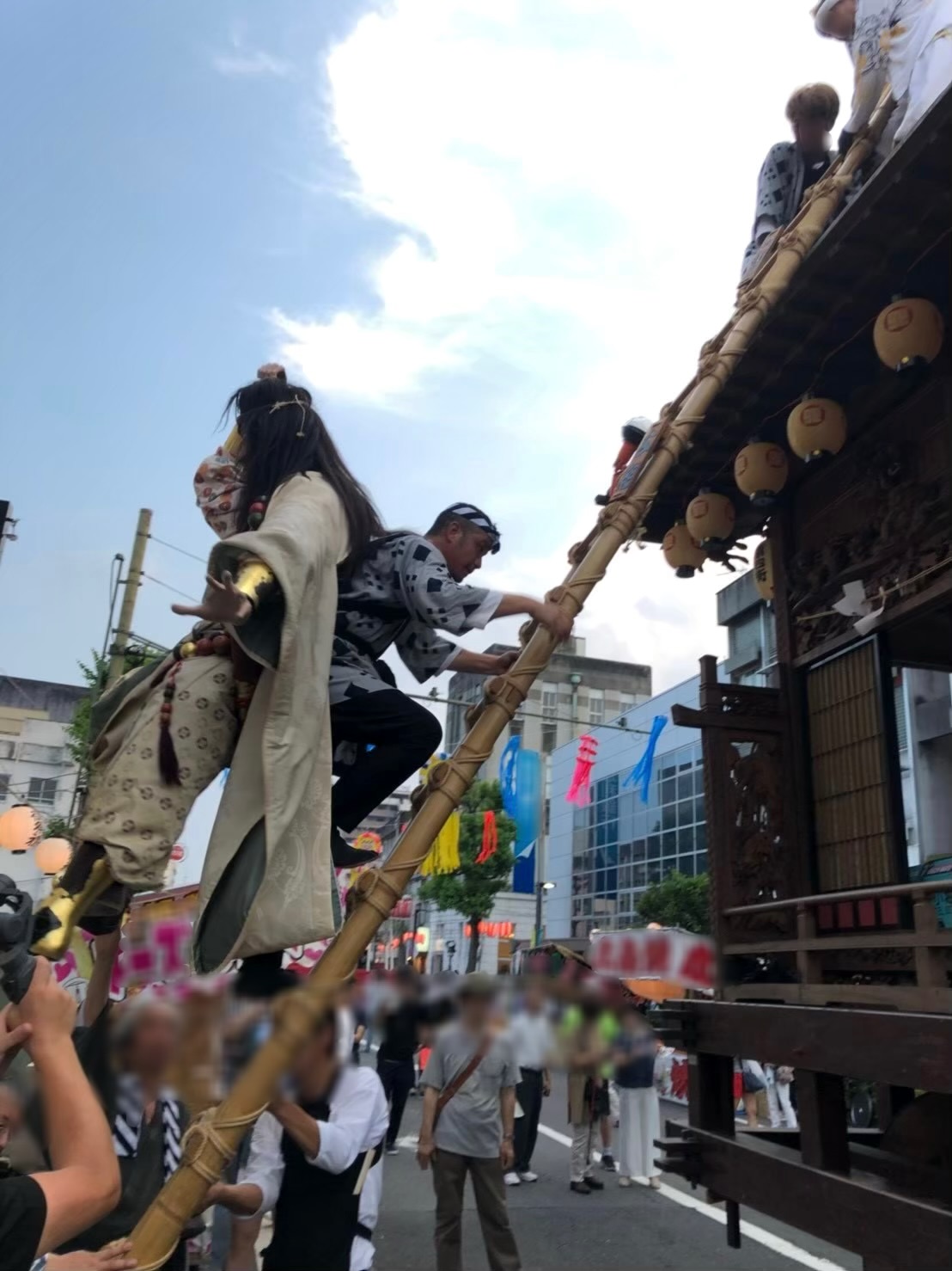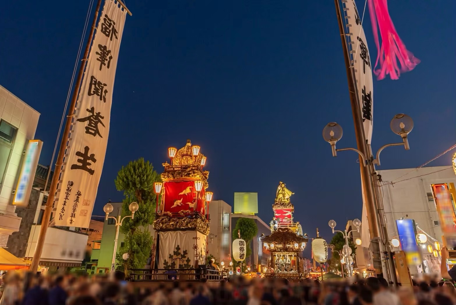 「桐生祇園祭」のメインイベント「翁鉾」と「四丁目鉾」の「曳き違い」は、道幅10mをいっぱいに使い観るものを圧倒する。