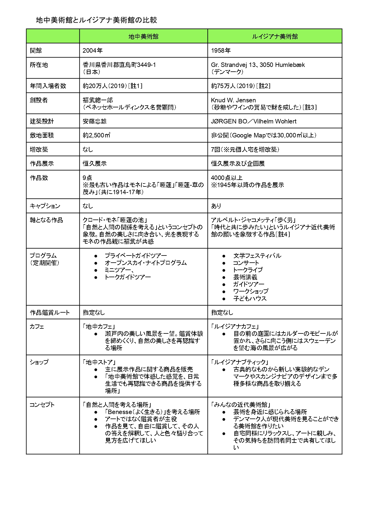 ここでは比較事例として、デンマークのルイジアナ美術館を取り上げる。「世界一美しい美術館」とも称されるこの美術館は、作品と建築と自然のコントラストを重視している点に加え、新館増築の際も景観を損ねないよう地下に展示室を設けたり、芝生と海が一望できるカフェ、またビジネスパーソンがつくった私設美術館という点でも共通点が多い。実際に福武自身もあるインタビューで「自然と現代美術が調和したところ」として、同美術館の名前を挙げている[註2]。
