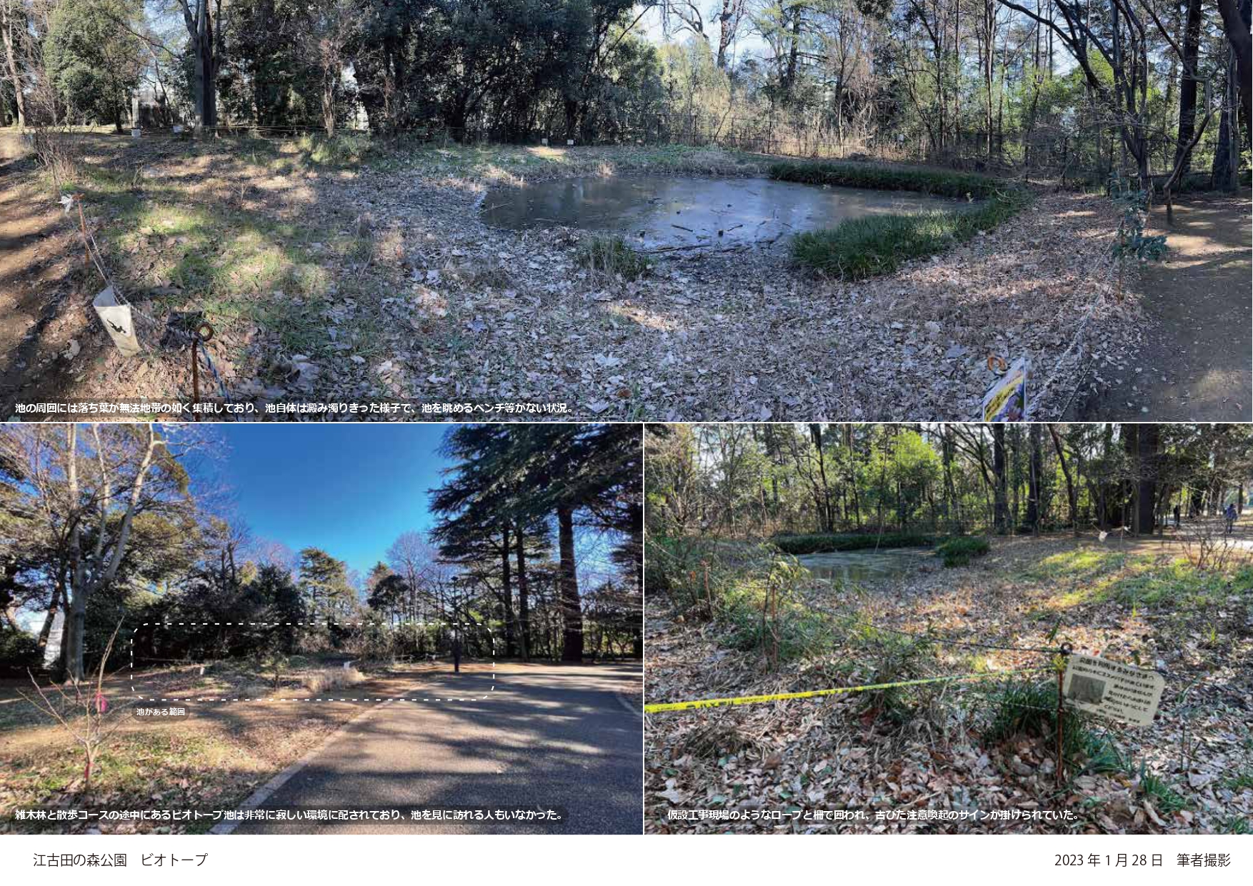 まず①において、訪れた時期は水庭と同時期である。また本公園は様々なプログラムが求められる場であるが、敷地面積は都内とはいえ、水庭と比較すると約3.75倍にも相当する面積を有している。しかし、このビオトープの池を訪れたのが冬季ということと深く関係していることを考慮しても、池の周囲には落ち葉が無法地帯の如く集積しており、池自体は澱み濁りきった様子で、ビオトープの池としては非常に寂しい状況であった[資料8]。池の外周にも池を眺めるベンチ等がない為、この池を楽しむ装置が用意されていなかった点は残念な評価となる[資料8]。転落防止用の柵も仮設工事現場のようなもので囲われており、注意喚起のサインも管理が行き届いているとは思えない放置された有様であったことから、①の評価は厳しいものとなった[資料8]。②においては、徒歩で駅から住宅街を抜け、公園に着き、公園内を散策した後に目的地に到着するという体験を経るが、ここに辿り着くまでの間、特別な②はされていなかった。ここまでの過程の帰結である目的地のこの光景からも、残念な気持ちを覚えた。公園内のルートも多数存在するが、時間のデザインとして目的地到着までの期待感や経験を想定した②は見つけることが出来なかった。