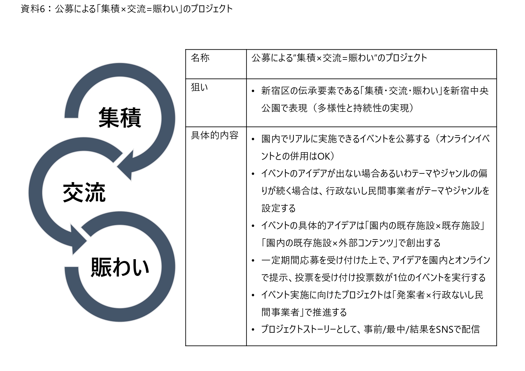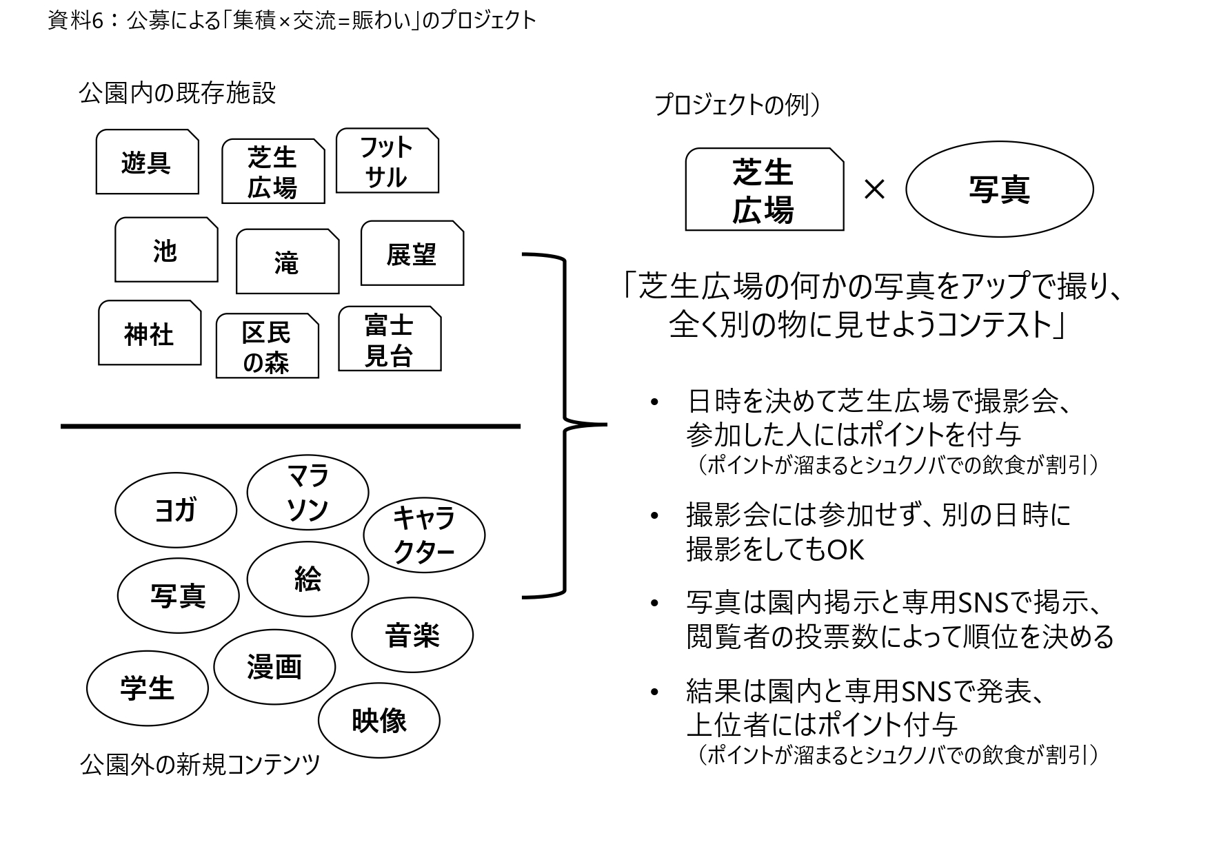 「集積・交流・賑わい」という伝承要素を活用した「公募による”集積×交流=賑わい”の創造プロジェクト」[資料6]を提言する。施設の集積という強みを活かし、外部コンテンツの導入によって更なる交流を創り出し、賑わうイベントを持続的に実施する、というプロジェクトである。イベントのアイデアは「園内の既存施設×既存施設」「園内の既存施設×外部コンテンツ」で考える。そして公募で募集をかけ、オンラインの投票で選定、ここでも集積と交流を広く生み出す。アイデア選定後は「発案者×行政ないし民間事業者」で実行、プロジェクトメンバーも集積と交流の対象とする。実際のイベントは園内で実施するが、事前のプロジェクトストーリーやプロジェクトの途中経過はオンラインで共有、結果もオンラインで共有する。発案者が出てこない場合は、行政ないし民間事業者がテーマのみを提示。テーマ提示に多様性を持たせることで、プロジェクト参加者を広げる効果も期待できる。