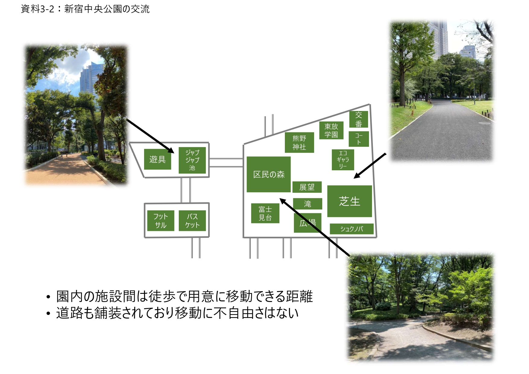 園内の3つのエリアは橋でつながり移動が可能。また園内は20分程度あれば徒歩で回ることもできる。周辺の高層ビルやホテルとも歩道橋で園内がつながっており、行き来が容易。入口も12カ所あり、目的の施設へ行きやすい[資料3-2]。交流という要素が実現できている。