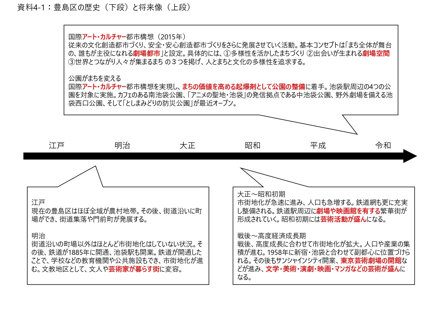 江戸時代は農村だった豊島区、大正~昭和時代に多くの芸術家が移住、芸術活動が生み出される。現在は国際アートカルチャー都市「まち全体が舞台の、誰もが主役になれる劇場都市」[7]を目指し、「公園がまちを変える」[8]をテーマに公園の改築に着手[資料4-1]。歴史と将来像の中に「芸術」という伝承要素がある。