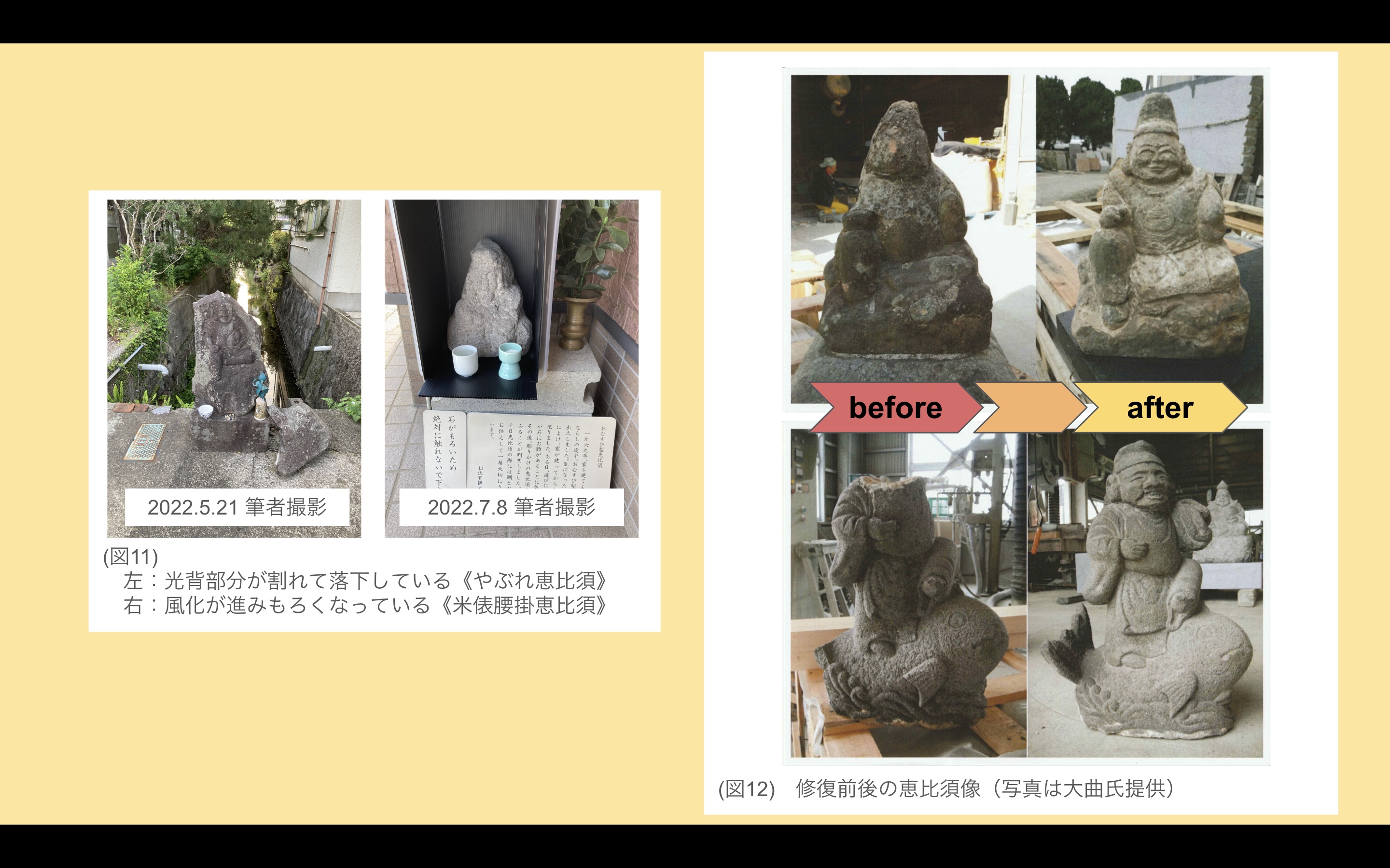 佐賀の恵比須像は安山岩や花崗岩など頑丈な石材が使われるが、実態は脆い部分もあり、頭や腕、光背部分が破損しやすい(図11)。また、屋外で祀られるため、自然の風化も受けやすい。