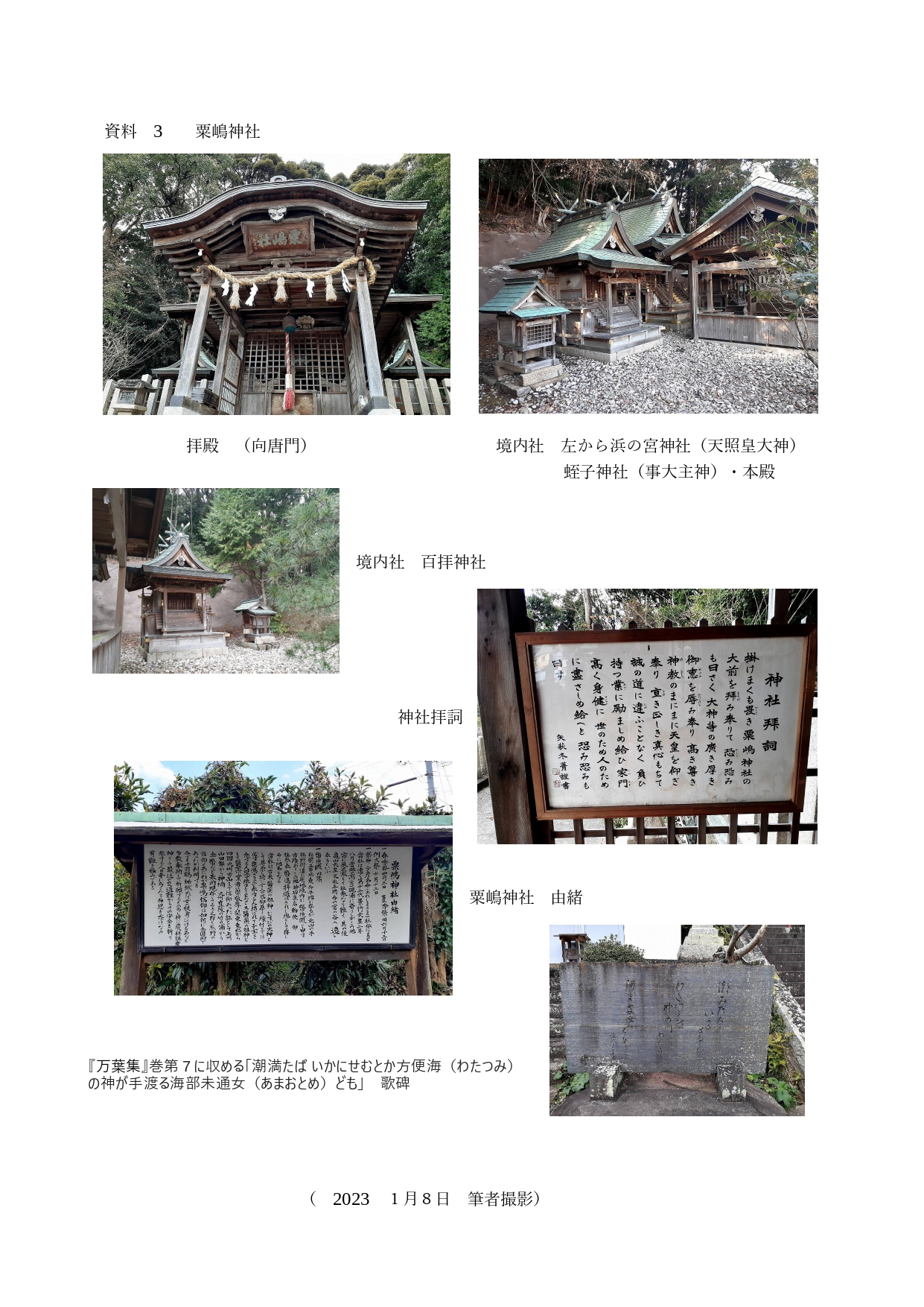 『芸術教養講義10・人や地域をつなぐ文化的交流のさまざまなありかたやその歴史』の中の「第3章:祭祀集団-村落における祭祀集団-宮座、頭屋制など」で学んだ宮座という形態に興味を持ち、また家内の実家がこの粟嶋神社の明神講21戸の1戸であることから、地域における宮座の歴史的背景も含め粟嶋神社の由緒を宮司の宮本和典氏にお話を伺いながら自分なりに考察してみた。