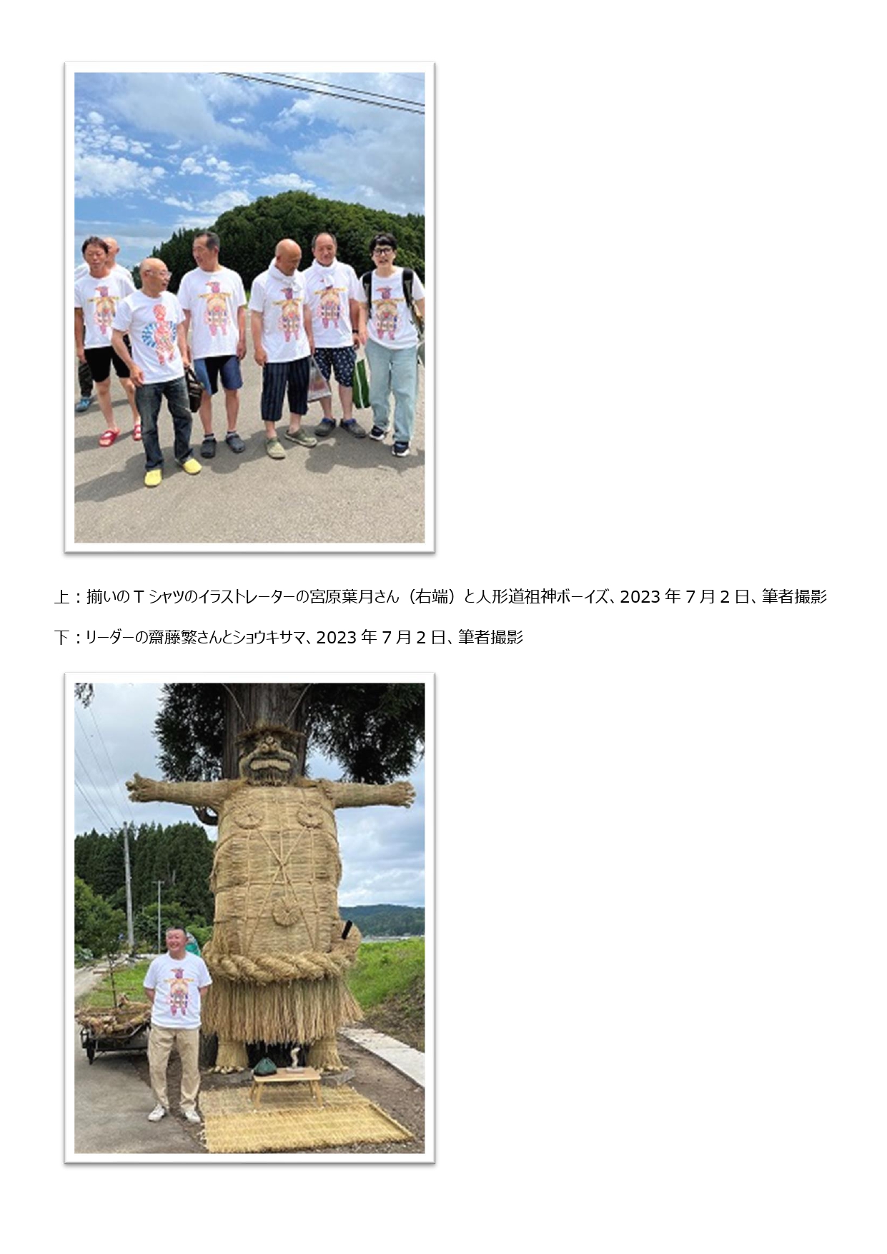 • (写真1)(左)横手市大森末野の集落の人々と完成したショウキサマ(2023年7月2日筆者撮影) (右)人形道祖神ボーイズとイラストレーターの宮原葉月さん(2023年7月2日筆者撮影)