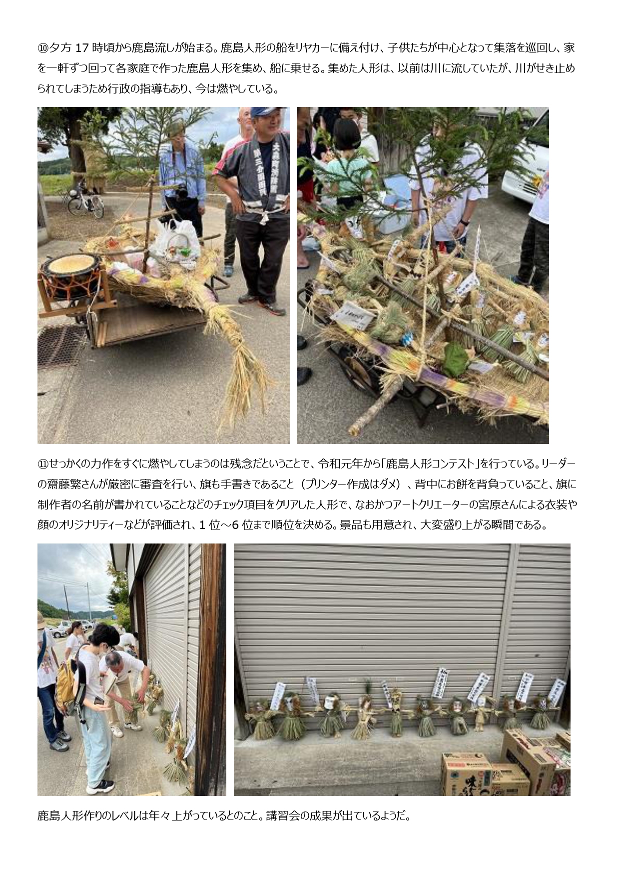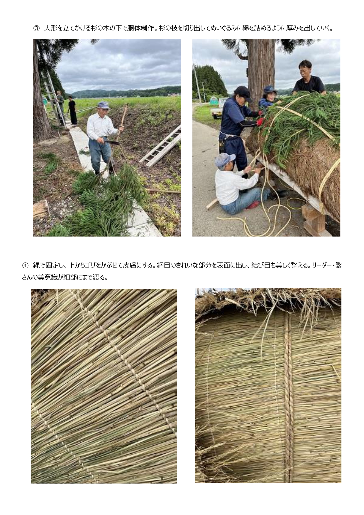 本来、「人形立て」は村の中で完結する行事なので、まれに藁を調達してくれる人がいることもあるが、基本的に外部から参加する人はほとんどいない。ANPの活動を通じて関心を持つ人が増え、最近では県内外からの見学者が多くなってきた。担い手が減る中で、今後はこうしたファン層の人たちも行事を見学させていただく範囲にとどまらず、協力して共に支えていくことが必要になるかもしれない。こうしたことが、ゆるやかなヨコのつながりと越境するコミュニティへと発展するのではないだろうか。