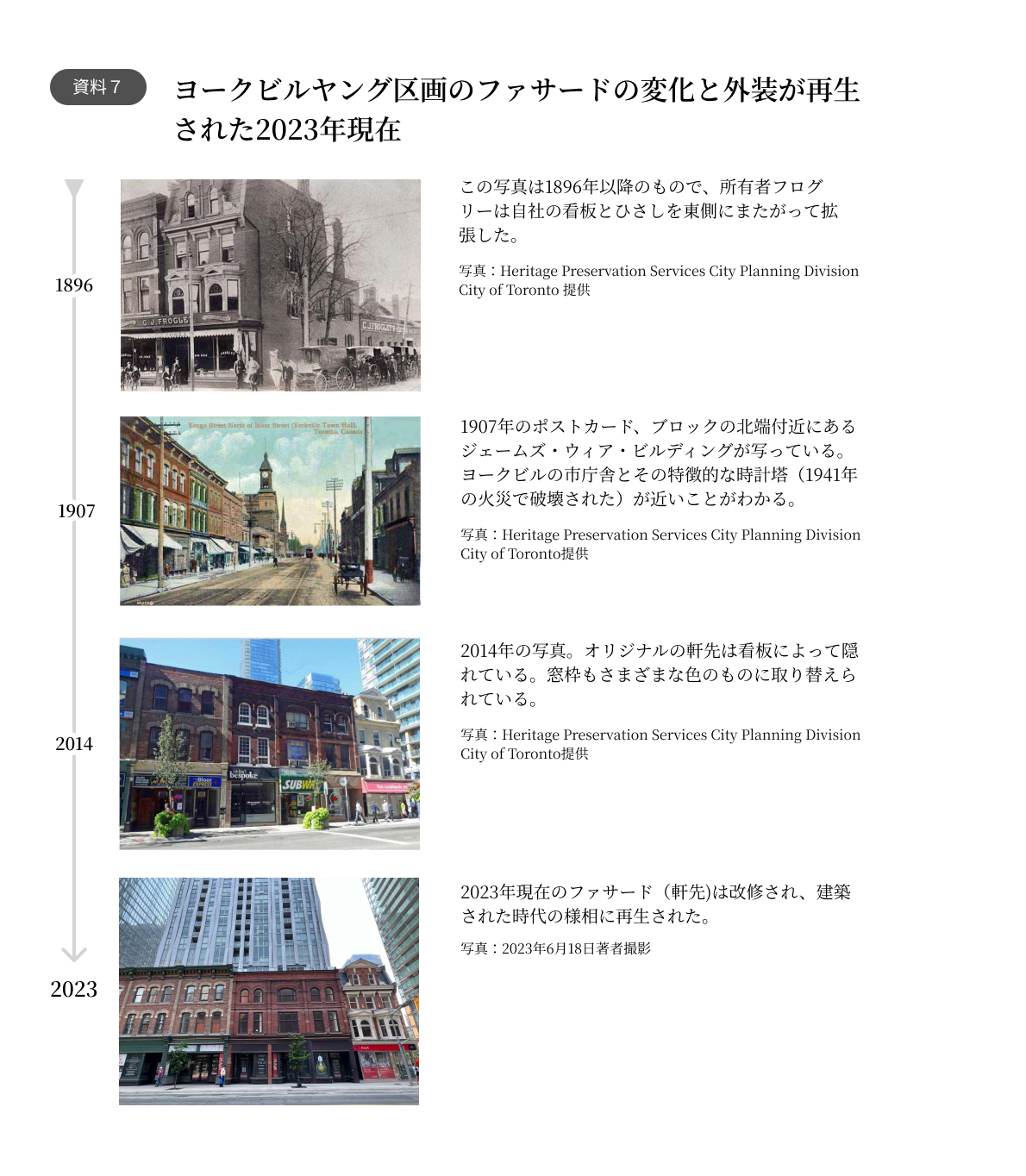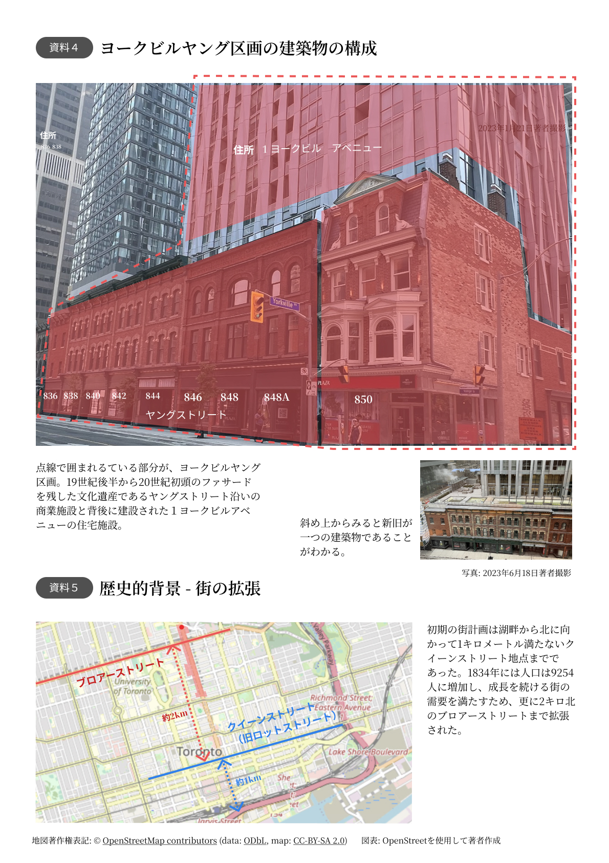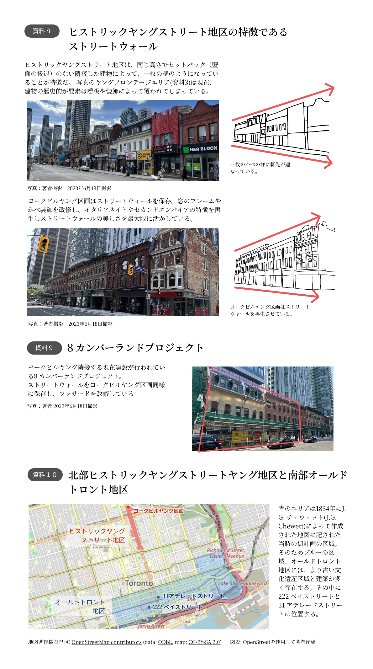 カナダ・オンタリオ州の首都トロントは、さまざまな背景を持つ人々が暮らす多文化な街である(註1)。現在300万の人口は、2030年までには350万人に増加すると予想されている(註2)。住宅建設への投資は、2017年から2022年にかけて140%に増加し(註3)、現在多くの建設工事が行われている。また、2022年時点で11,009件 (註4)が文化遺産建築として登録され、その保存が積極的に行われている。本稿では住宅や商業施設を増建築しながら文化遺産を保存する方法「ファサーディズム」に着目する。その中でもヨークビルヤング区画(資料1)の文化遺産を活用した、景観保存の評価と課題を考察する。