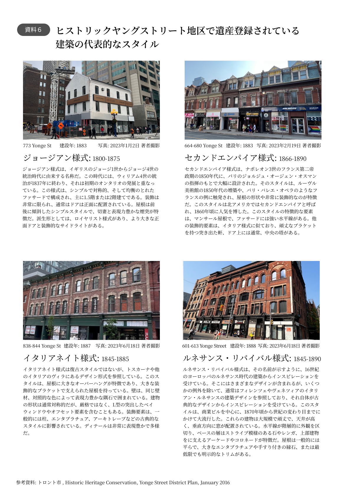 トロントの原型となる街、ヨークは1793年、イギリス人による植民地として発展した(註8)。当時の人口は212人で、初期の街計画は、湖畔から北に向かって1キロメートルに満たない、クイーンストリート地点までであった(資料5)。1834年には人口は9254人に増加し、成長を続ける街の需要を満たすため、2キロ北のブロアーストリートまで拡張された (註9)。その拡張されたエリアに、本稿で着目するヨークビルヤング区画は位置する。その時代に建築された建物には、前述したセカンドエンパイア様式やイタリアネイト様式に加え、ジョージアン様式やルネサンス・リバイバル様式もあり(資料6)、現在多くが文化的遺産として登録されファサーディズムに活用されている。