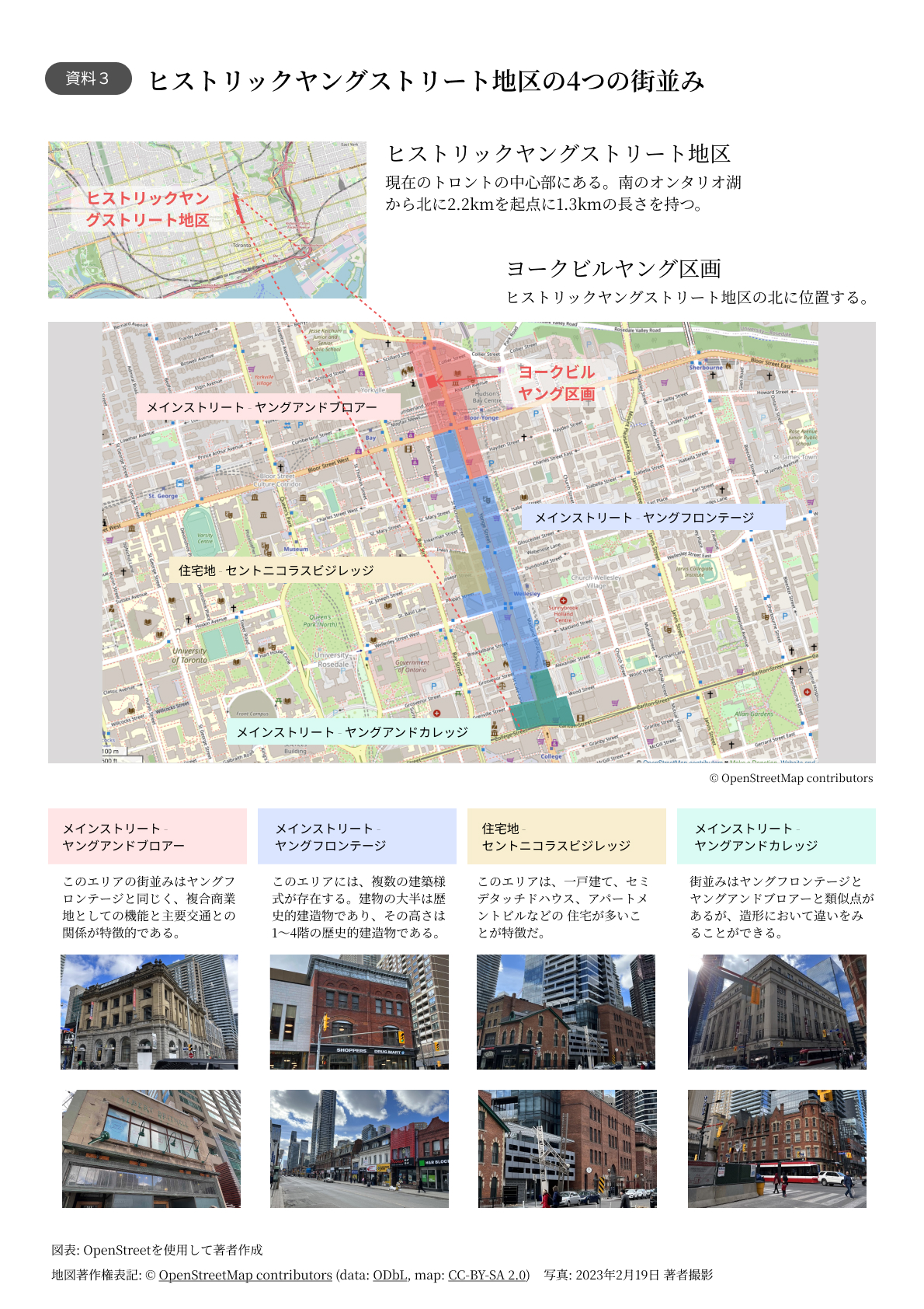 本稿で注目するヨークビルヤング区画の所在地は、1 ヨークビル アベニューから836 〜 850ヤングストリートである(資料2) 。区画はヒストリックヤングストリート地区 (以下ヤング地区)の4つに分かれるエリアの北に位置する(資料3)。