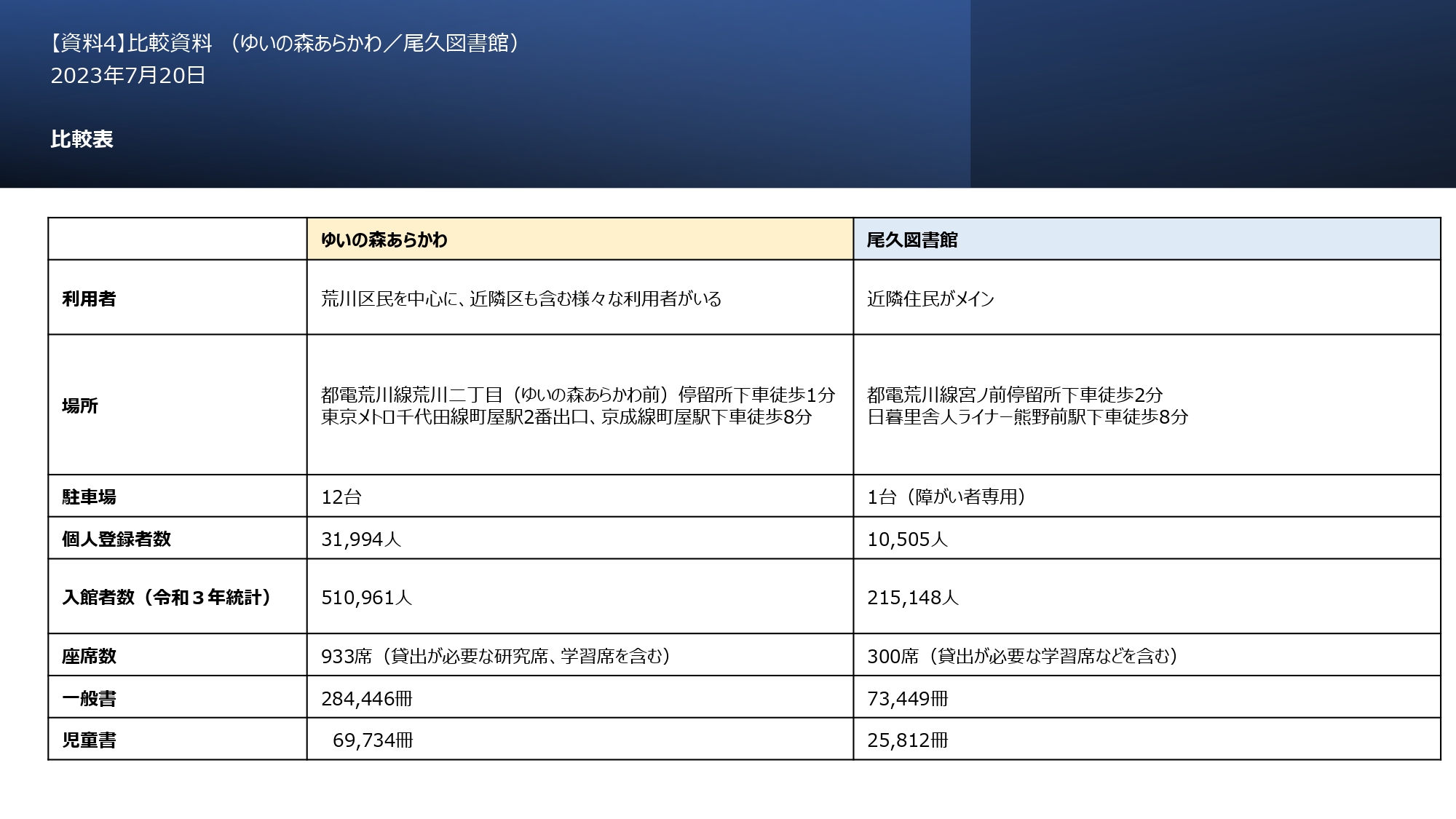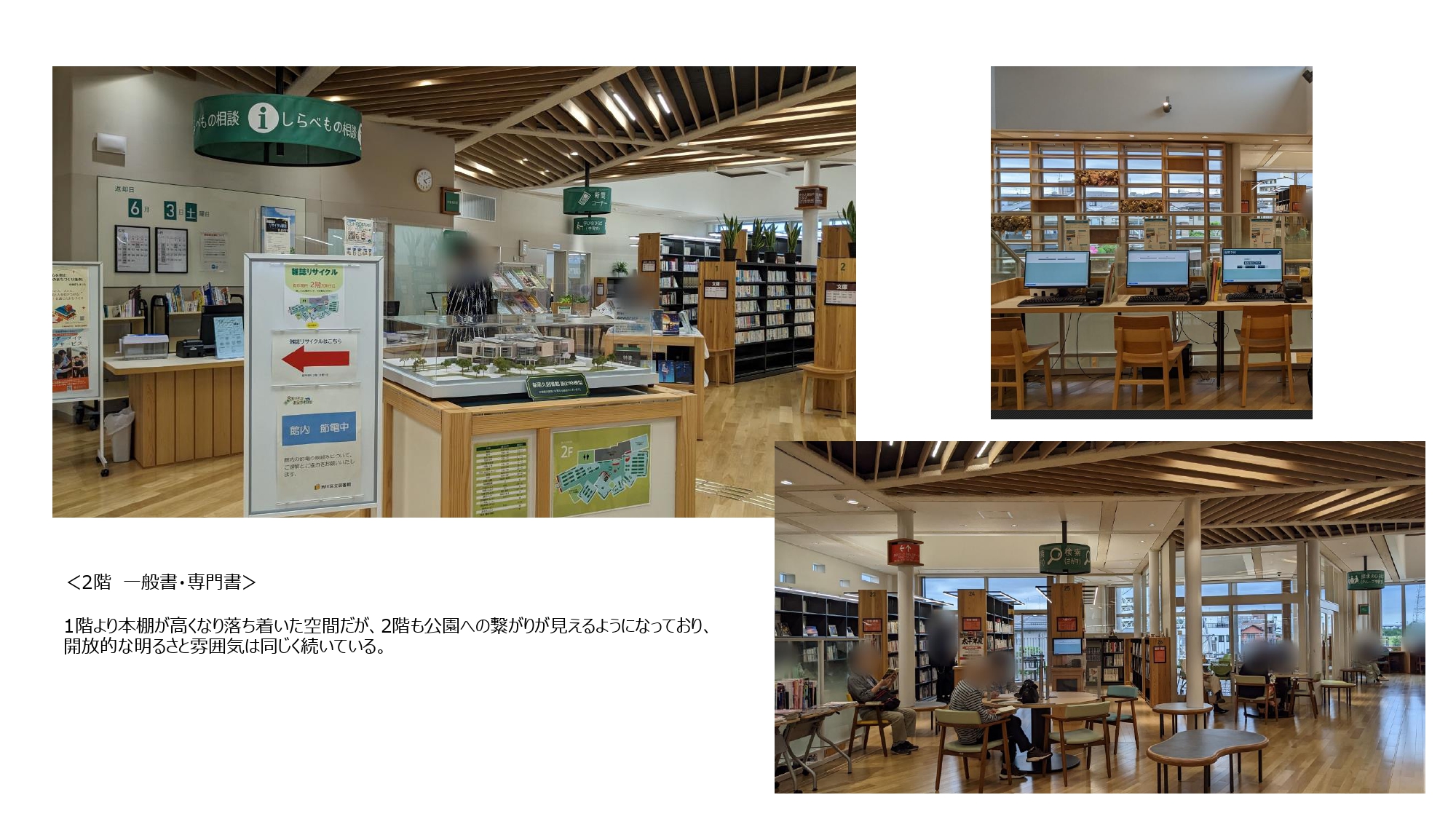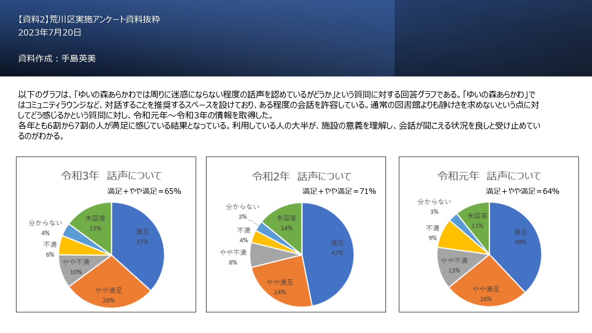 (23)ゆいの森の担当者によると一日の来場者数が三千人程度になる土日は混雑が予想されることから、土日に不特定多数を呼ぶイベントを実施するのは難しい状況にあるという(添付「【資料6】ゆいの森あらかわへの質問回答」参照)。比較であげた尾久図書館などは週末に公園広場を活用した無料のイベントなどを実施しており、これは屋外と一体化出来た施設の強みであるともいえるだろう。だが、土日に多くの人が集まるというのは、新しい「学びのコミュニティ」を実施するのにとても良い環境であるともいえる。今後、予約の不要なイベントも企画中であるという。過去には平日ではあるが、外国人向けに日本語教室などを実施していた履歴も確認したので(親子日本語サロン ※現在休止中 https://arakawa-kokusai.com/japanese_salon/ 2023年7月20日閲覧)、ここでは一方通行にならない、異文化交流という形の「学びのコミュニティ」の提案をした。