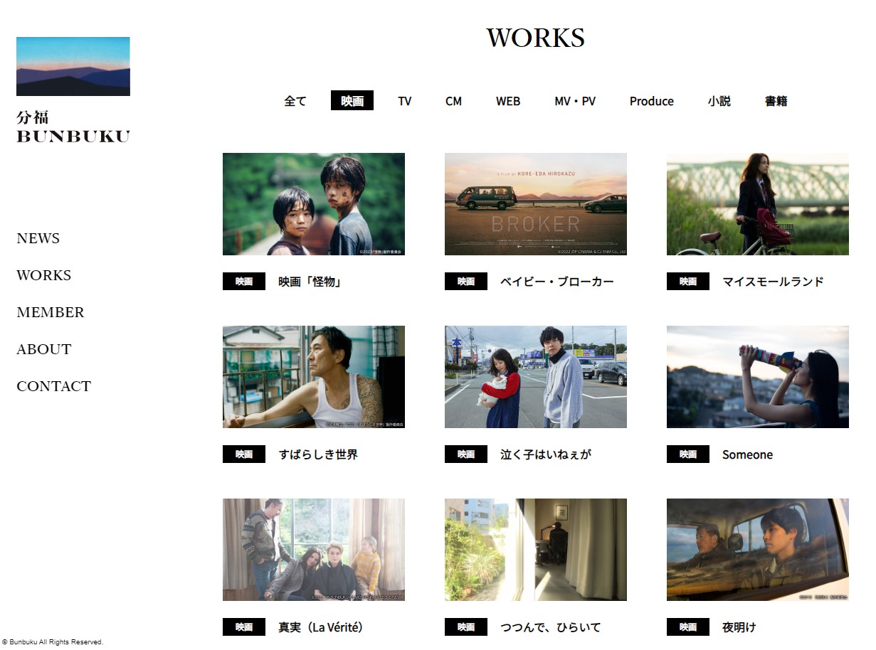 • [画像4]「分福」のホームページより、「分福」のメンバーが手がけた映画の数々。是枝監督の『怪物』(2023)、『ベイビー・ブローカー』(2022)、『真実(La Vérité)』(2019)、西川美和監督の『すばらしき世界』(2021)、川和田恵真監督の『マイスモールランド』(2022)、佐藤快磨監督の『泣く子はいねぇが』(2020)、河股藍監督の『Someone』(2019)、広瀬奈々子監督の『つつんで、ひらいて』(2019)ほか。