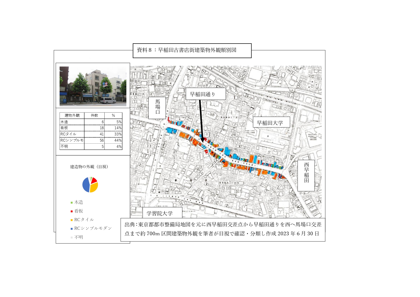 [資料8:出典・東京都都市整備局(IX-LD07-3 28-10 高田馬場)東京都地形図1:2500(平成25年7月現地所調査)をもとに早稲田通り(西早稲田交差点から馬場口交差点までの区間)の建物外観(現在)を筆者が目視で確認・分類し、加工して作成、2023年6月30日]